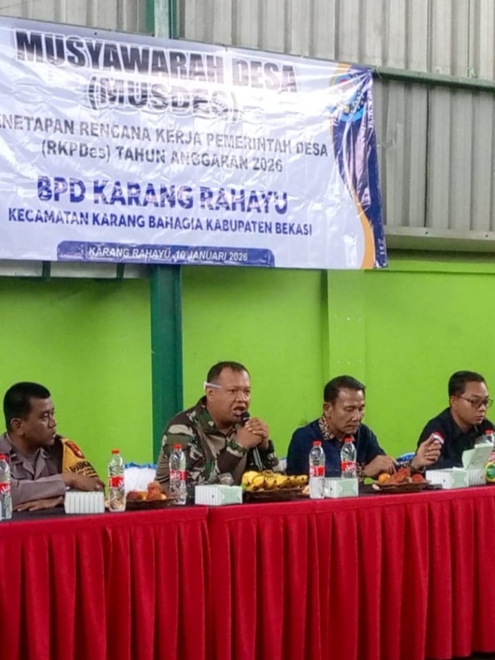 Kabupaten Bekasi – Pemerintah Desa Karang Rahayu bersama unsur TNI-Polri menggelar Musyawarah Desa (Musdes) untuk menyelaraskan RKPdes 2026, program pembangunan desa dengan kebijakan pemerintah pusat. Dalam kesempatan tersebut, Bhabinsa Karang Rahayu memaparkan tiga program prioritas yang akan segera diimplementasikan untuk kesejahteraan warga.