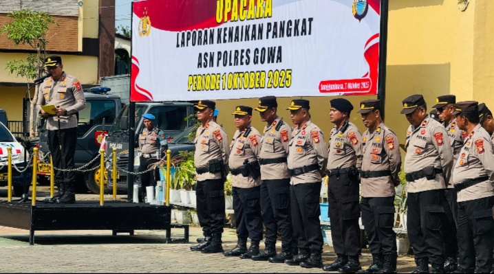 Divisinews.com//Gowa,- Polres Gowa menggelar upacara laporan kenaikan pangkat bagi Aparatur Sipil Negara (ASN) bertempat di Lapangan Apel Griya Bhayangkara Polres Gowa, Selasa ( 7/10/2025).