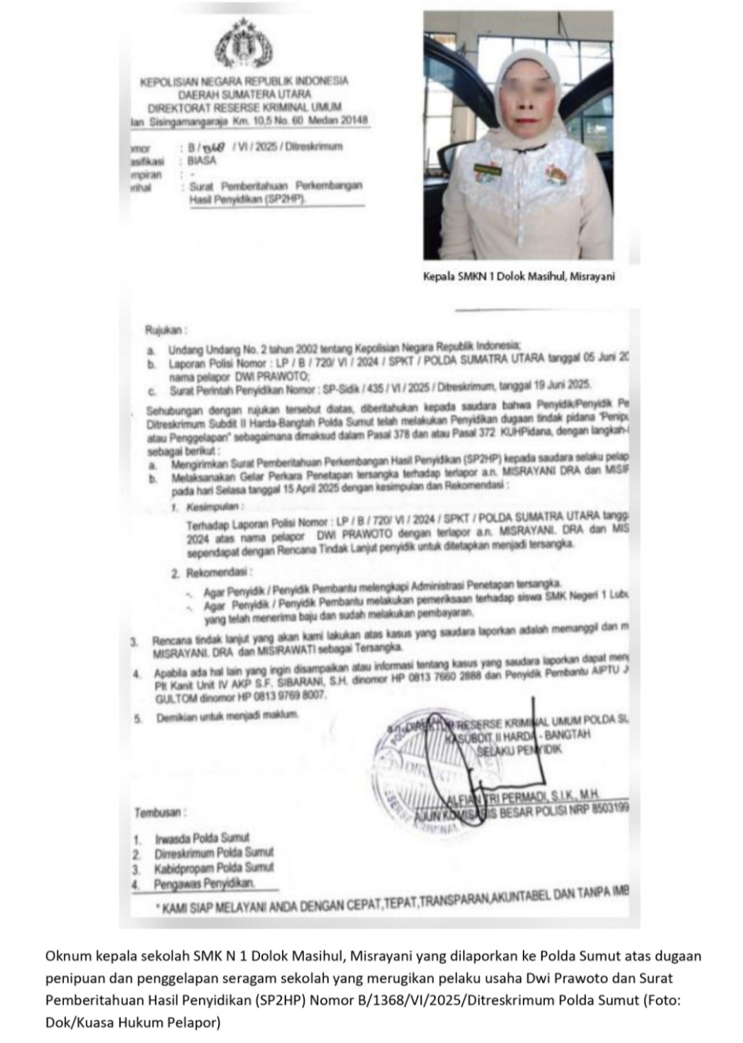 Divisinews.com//Medan,- Penanganan kasus dugaan penipuan dan penggelapan yang melibatkan Kepala SMKN 1 Dolok Masihul, Misrayani SPd MSi, memasuki babak baru. Polda Sumatera Utara memastikan Berita Acara Pemeriksaan (BAP) telah dikirim ke kejaksaan untuk proses hukum lebih lanjut.