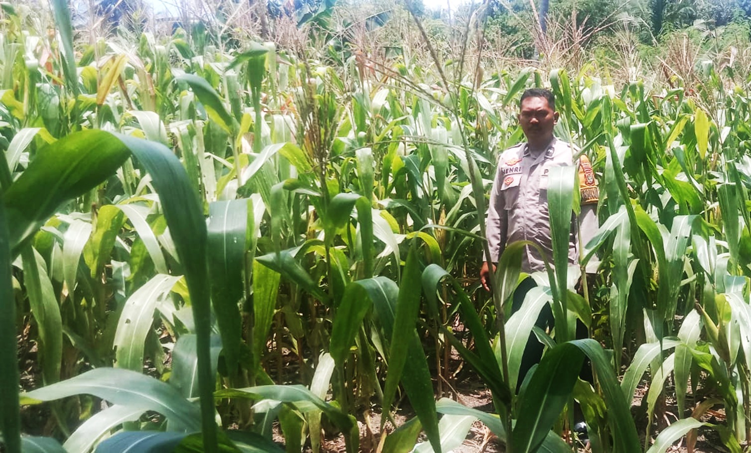 Dalam kegiatan tersebut, Aipda Henri Suseno turun langsung ke lokasi kebun untuk melihat kondisi tanaman jagung yang dikelola oleh kelompok tani setempat. Dari hasil pemantauan, tanaman jagung terlihat tumbuh dengan baik dan memasuki masa menjelang panen.