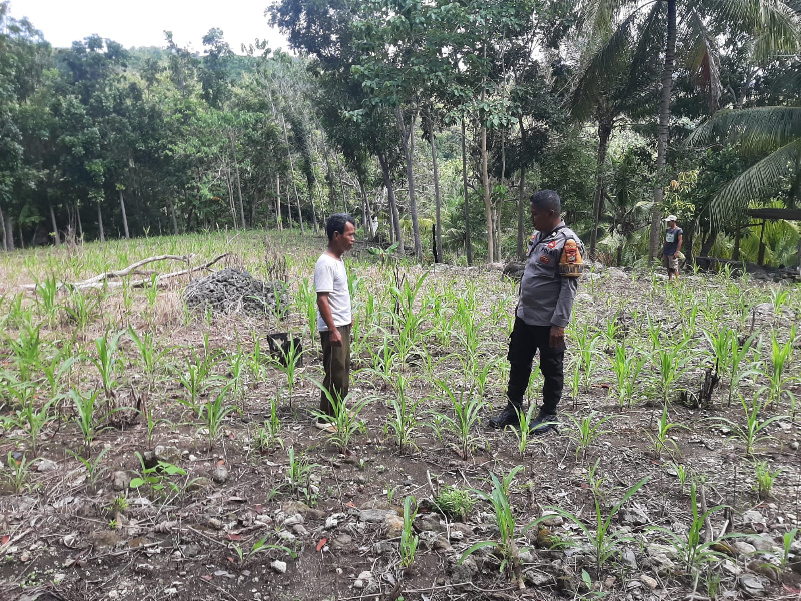 Dalam kegiatan tersebut, Aiptu Achmad melakukan pemantauan langsung terhadap perkembangan tanaman jagung yang saat ini diperkirakan telah memasuki usia sekitar dua bulan. Tanaman jagung tampak tumbuh subur, menandakan perawatan yang dilakukan para petani berjalan dengan baik.