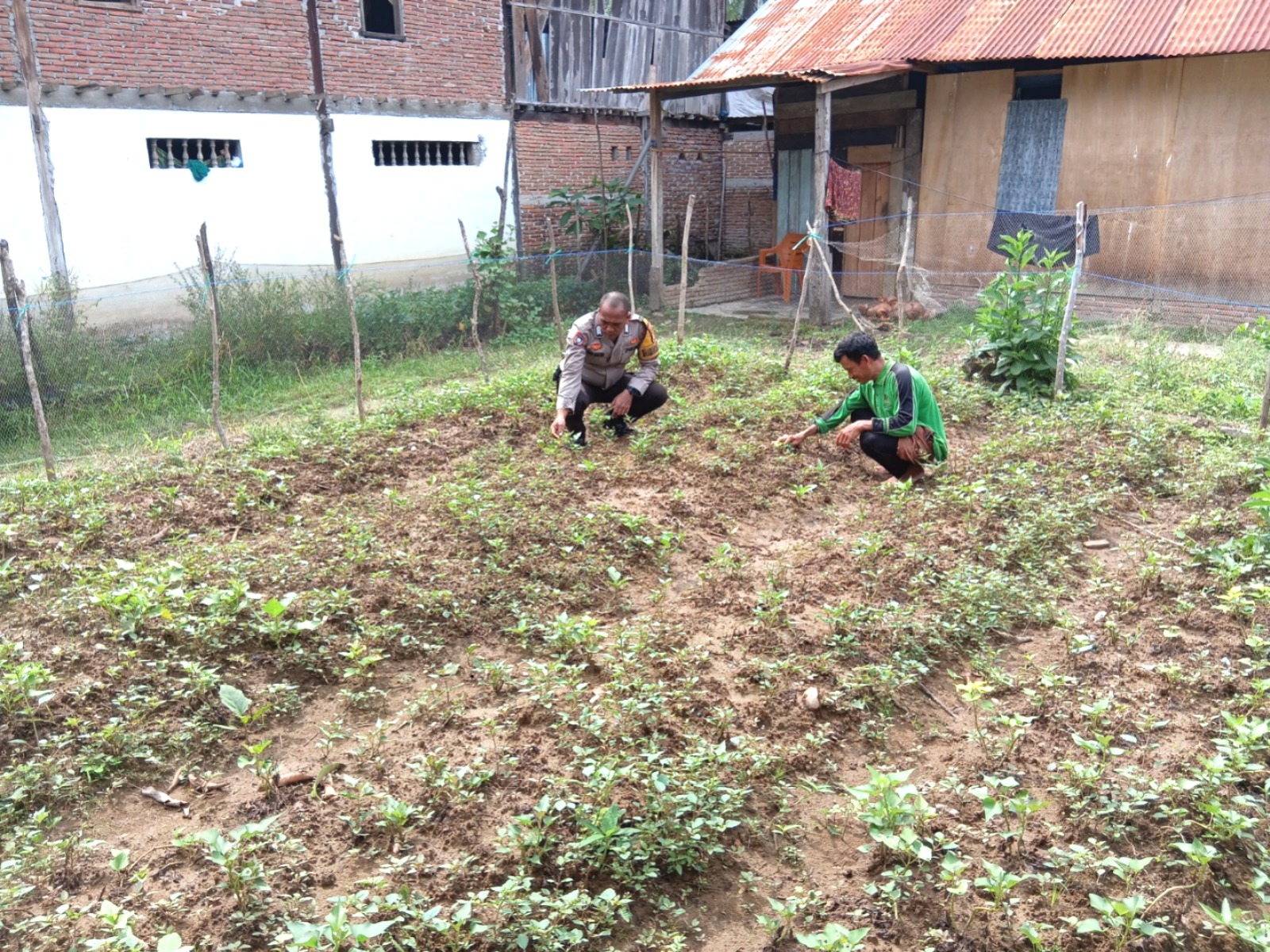 Dalam kegiatan tersebut, BRIPKA Abd. Basir meninjau langsung pekarangan warga yang dikelola secara mandiri dengan menanam berbagai jenis tanaman pangan, seperti ubi kayu, ubi jalar, serta beberapa tanaman lainnya. Pekarangan yang sebelumnya tidak dimanfaatkan secara maksimal kini berubah menjadi lahan produktif yang mampu menopang kebutuhan pangan keluarga.