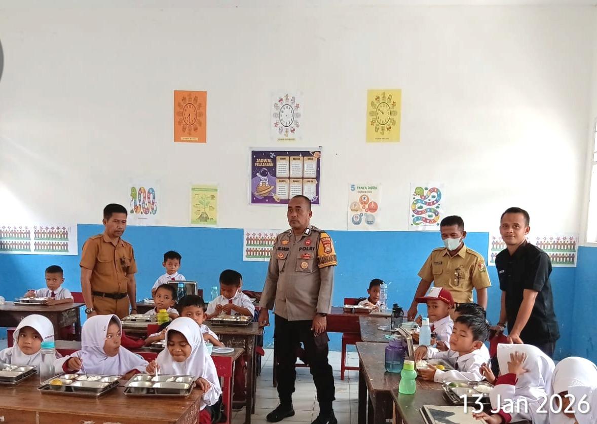 MAJENE – Bhabinkamtibmas Polsek Malunda Polres Majene, BRIPKA Abd. Basir, melaksanakan pengawalan kegiatan penyaluran dan pembagian Makanan Bergizi Gratis (MBG) bagi siswa-siswi SD Negeri 03 Mosso, Desa Lombong Timur, Kecamatan Malunda, Kabupaten Majene, Selasa (13/1/26).