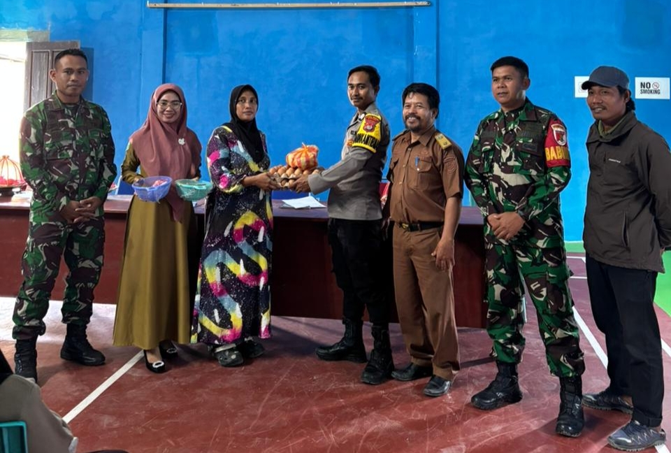 POLMAN — Bhabinkamtibmas Desa Landi Kanusuang, Sub Sektor Mapilli, Polsek Urban Wonomulyo, Polres Polewali Mandar, Brigpol Baginda Ali menghadiri kegiatan Pemberian Makanan Tambahan (PMT) bagi ibu hamil yang berlangsung di Aula Kantor Desa Landi Kanusuang, Kecamatan Mapilli, Kabupaten Polewali Mandar, Sulawesi Barat, Selasa (13/1/2026) pagi.