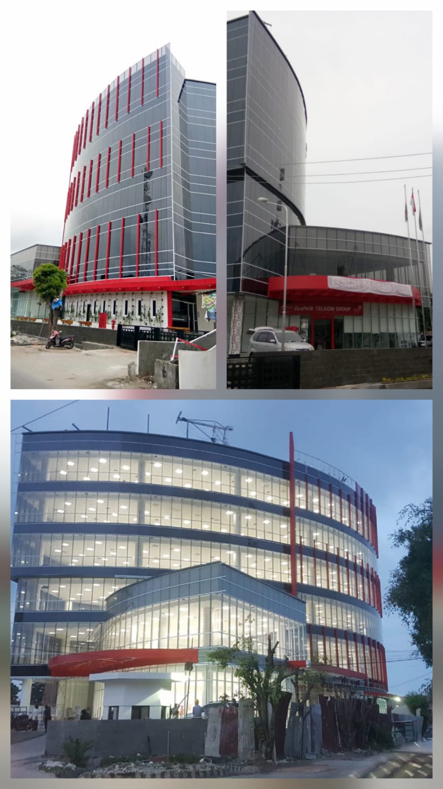 Foto: Gedung pada saat pengujian kelayakan operasional pada Maret 2018. Commissioning Test (tahap yang sangat krusial sebelum sebuah gedung resmi dibuka atau digunakan) dan Gambar peresmian gedung Telkom Witel dan Tsel Kota P. Siantar Tahun 2018.