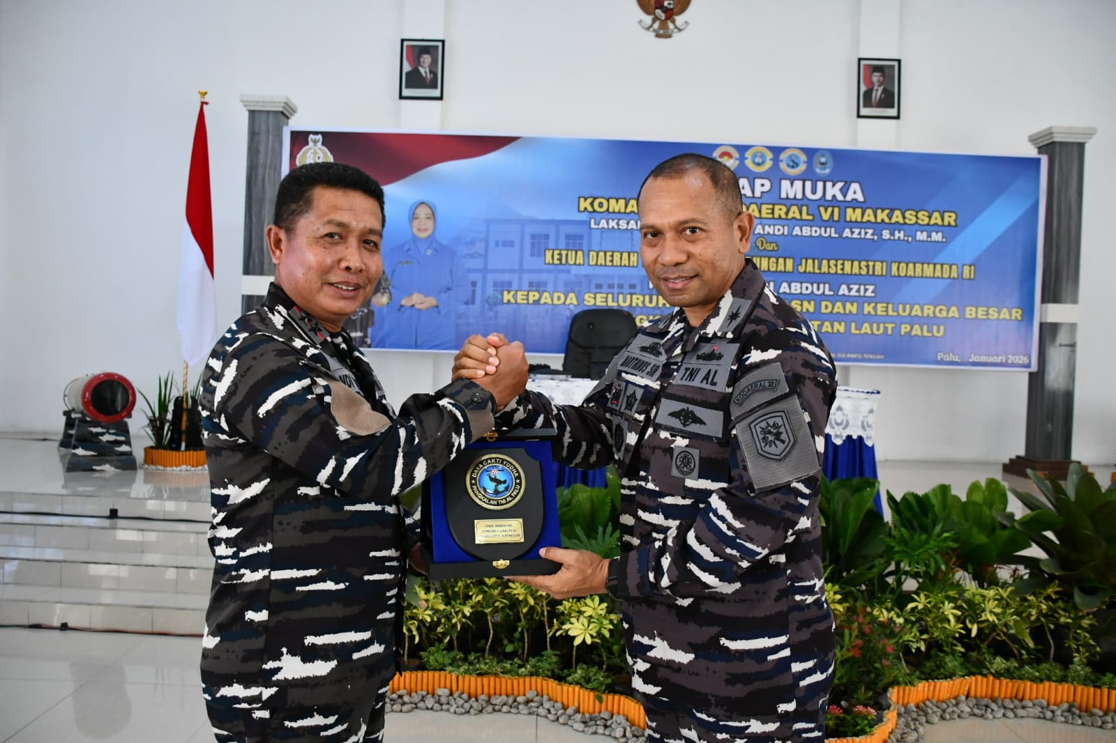 Divisinews.com,- Palu , Keberadaan TNI Angkatan Laut diharapkan dapat dirasakan manfaatnya tidak hanya dalam mewujudkan keamanan laut tetapi juga bagi masyarakat setempat. Hal tersebut ditekankan Komandan Komando Daerah TNI Angkatan Laut VI (Dankodaeral VI) Laksamana Muda TNI Andi Abdul Aziz, S.H., M.M., didampingi Ketua Daerah Kodaeral VI Gabungan Jalasenastri Koarmada RI, Ny. Upiek Andi Abdul Aziz, saat melaksanakan kunjungan ke Mako Lanal Palu. Senin,12 Januari 2026.