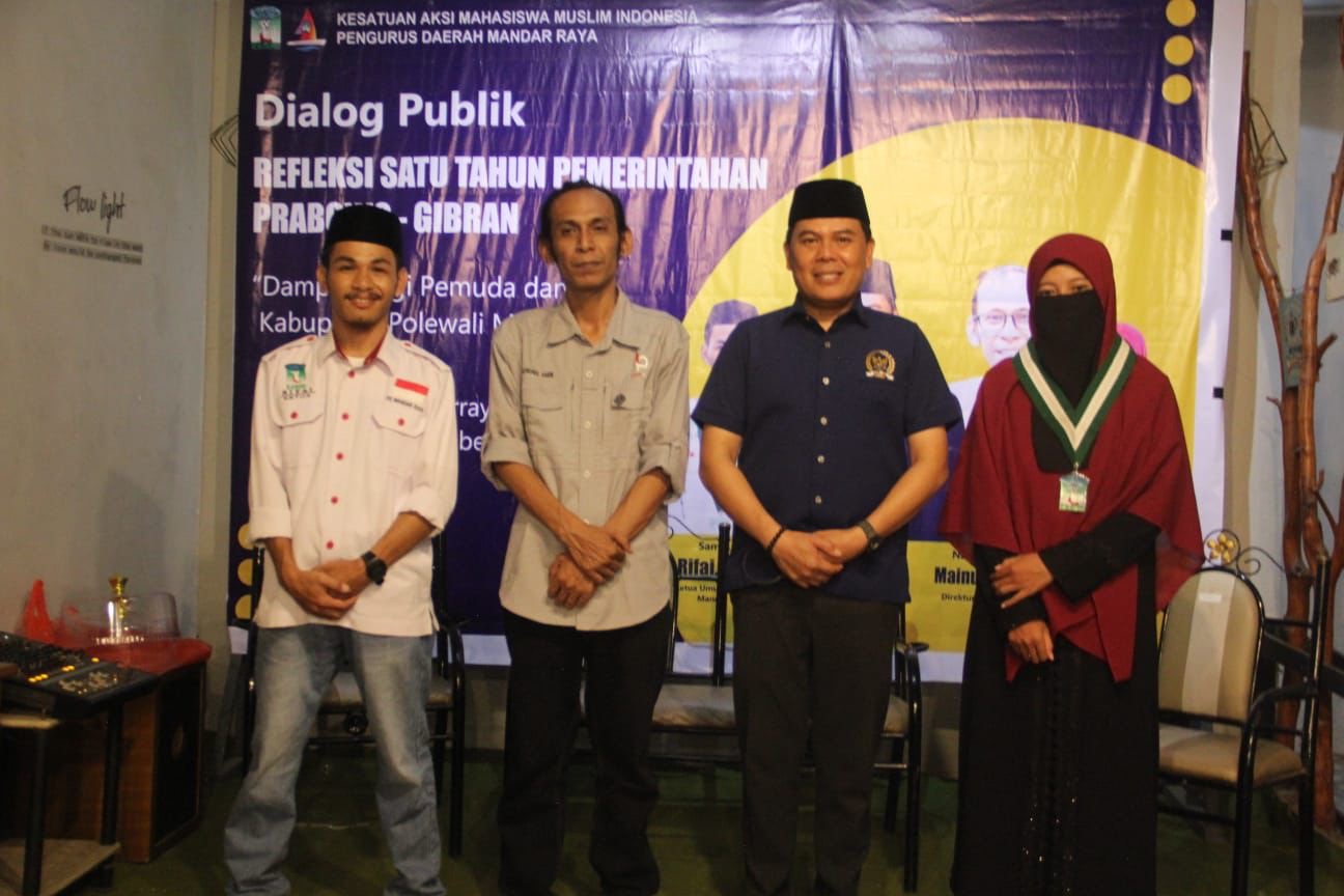 Divisinews.com, Polewali Mandar – Dalam rangka memperingati satu tahun kepemimpinan Presiden Prabowo Subianto dan Wakil Presiden Gibran Rakabuming Raka, Kesatuan Aksi Mahasiswa Muslim Indonesia (KAMMI) Mandar Rayamenggelar kegiatan Dialog Publik Refleksi Satu Tahun Pemerintahan Prabowo–Gibran pada Senin malam (20/10/2025) bertempat di NR Coffee, Jl. Budi Utomo, Kelurahan Pekkabata, Kecamatan Polewali, Kabupaten Polewali Mandar.