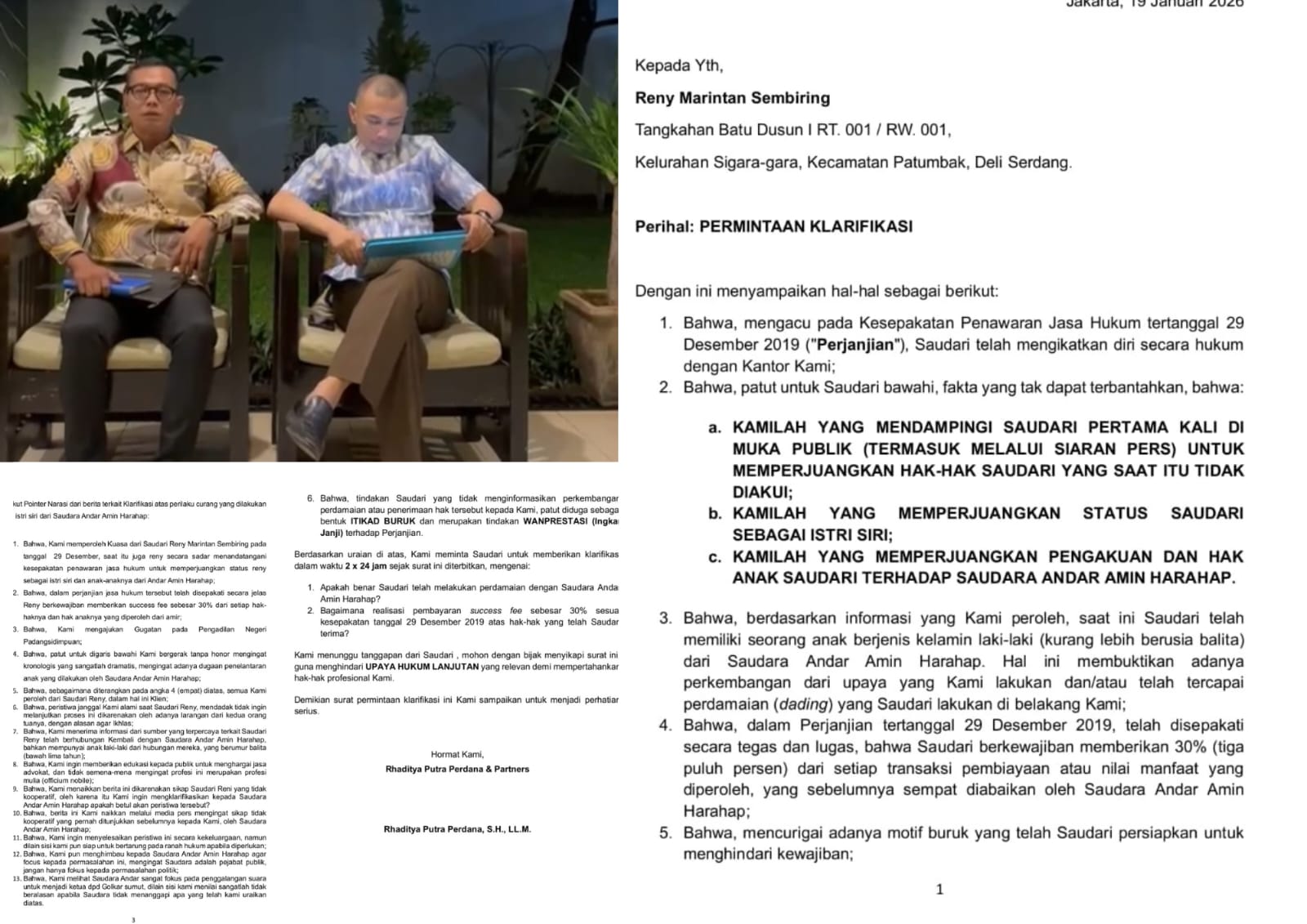 Sebelumnya, pada 29 Desember 2019, pihaknya telah mengikat hubungan hukum dengan Reny melalui kesepakatan penawaran jasa hukum yang sah. Mereka tidak hanya mendampingi klien ke ruang publik dan media massa untuk memperjuangkan pengakuan status istri siri serta hak anak terhadap Andar Amin Harahap, tetapi juga mengajukan gugatan ke Pengadilan Negeri Padangsidimpuan tanpa pamrih. Dalam perjanjian itu telah jelas disepakati, Reny wajib memberikan success fee sebesar 30 persen dari setiap manfaat atau hak yang diperoleh dari Andar.