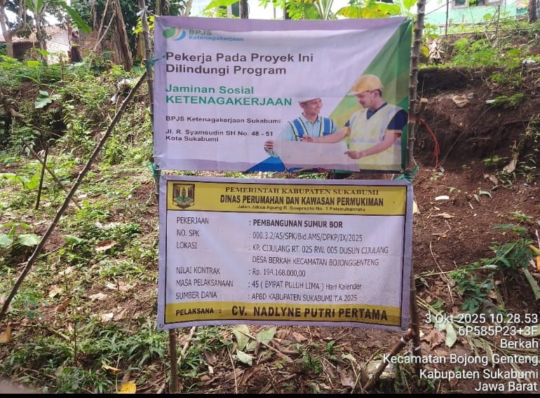 Sukabumi ,Divisinews.com – Pemerintah Kabupaten Sukabumi melalui Dinas Perumahan dan Kawasan Permukiman (Perkim) kembali menghadirkan program yang menyentuh kebutuhan dasar masyarakat. Kali ini, pembangunan sumur bor dilaksanakan di Kampung Cijulang RT 025/005.Dusun Cijulang, Desa Berkah, Kecamatan Bojonggenteng, Kabupaten Sukabumi, pada jumat ,(3/10/2025).