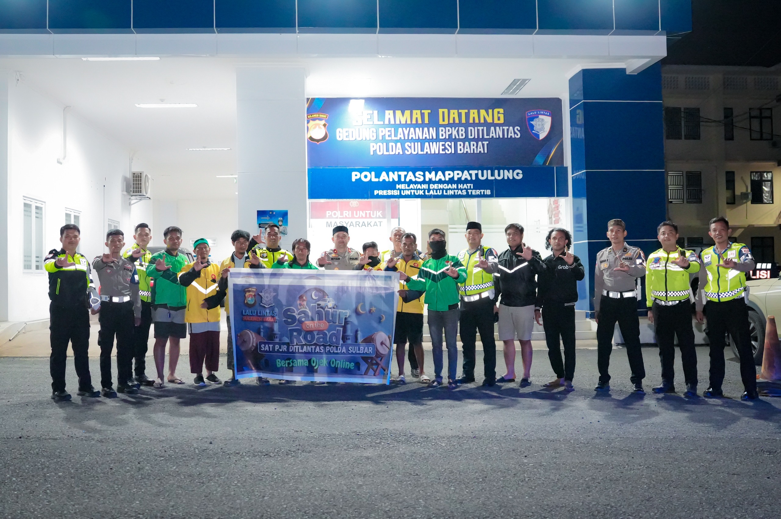 Sulawesi Barat – Satuan Patroli Jalan Raya (Sat PJR) Ditlantas Polda Sulawesi Barat menggelar kegiatan Aksi Sahur On The Road bersama para driver Ojek Online (Ojol), Minggu (8/3/26).