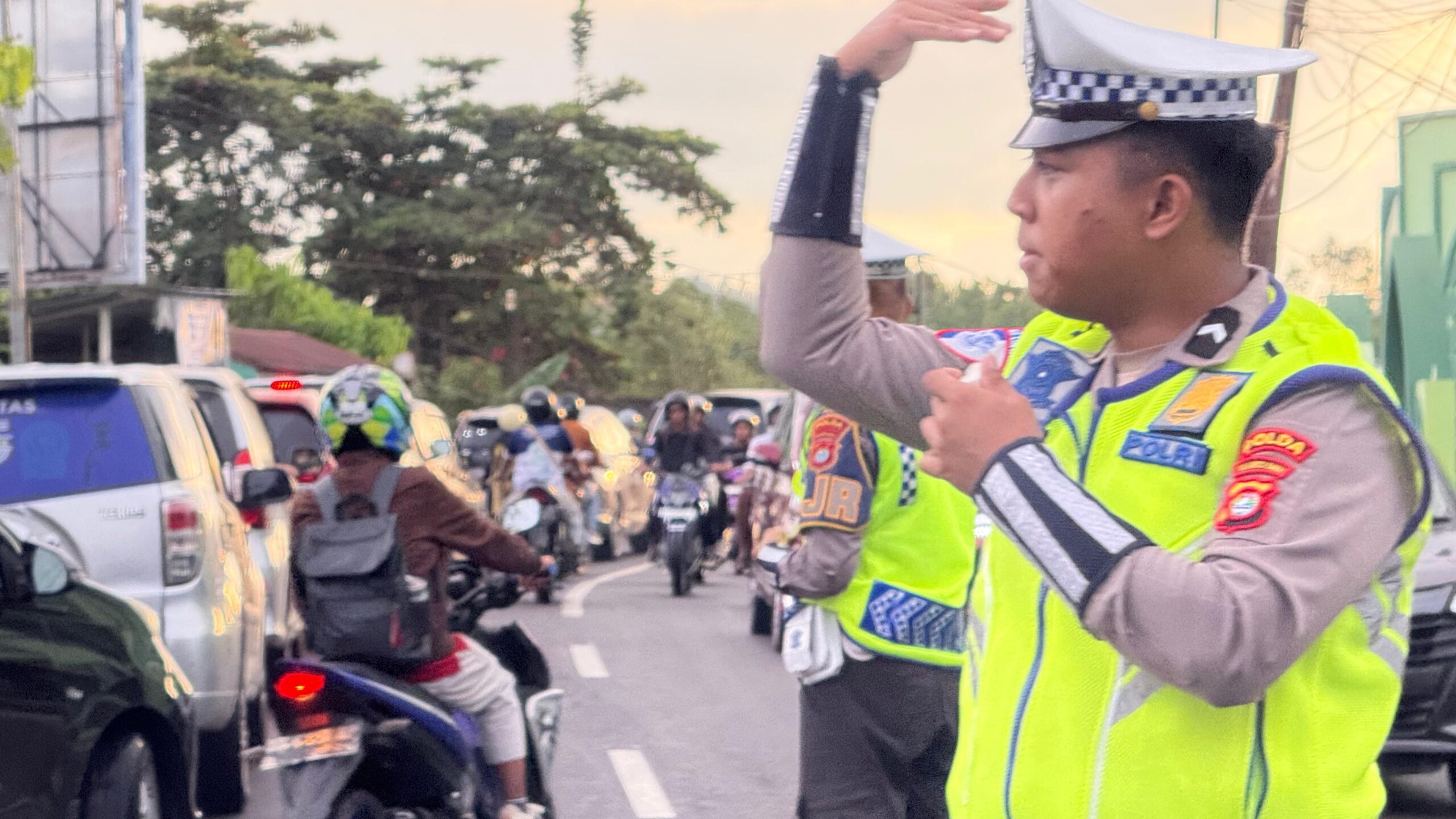 Salah satunya di persimpangan Masjid Karema, personel Ditlantas terlihat sibuk mengatur arus lalu lintas yang cukup padat, Sabtu (31/1/26).