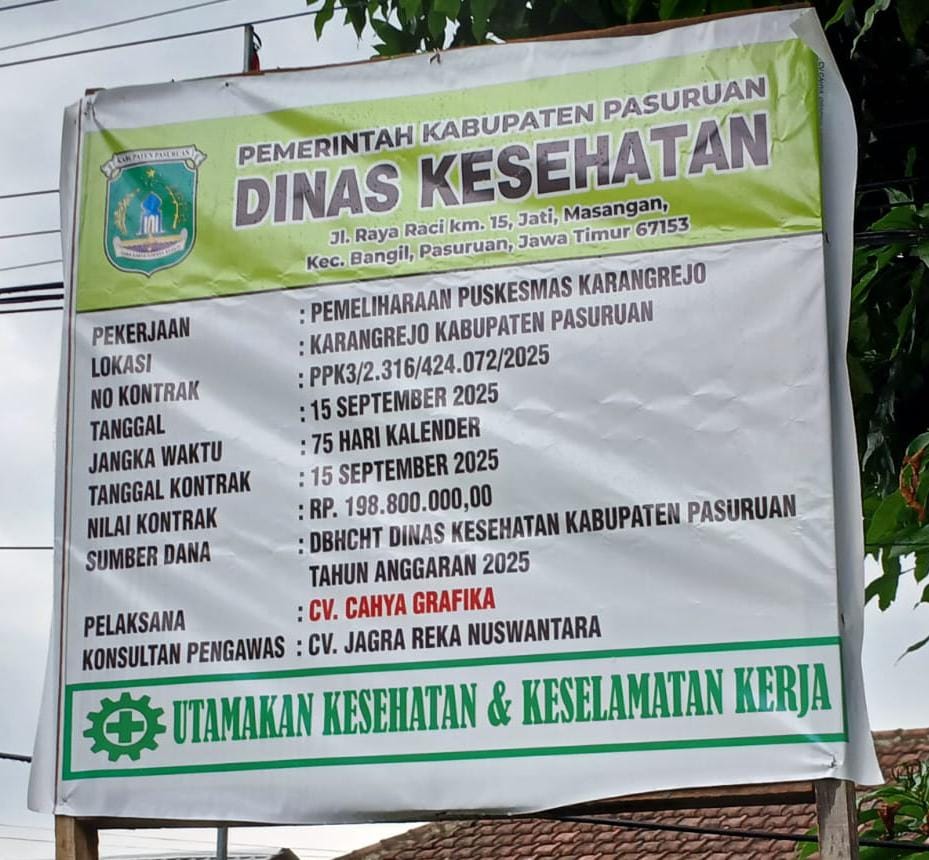 Nilai proyek Rp 198.800.000,00.Sumber Dana: DBHCHT Dinas Kesehatan Kabupaten PasuruanLokasi: Puskesmas Karangrejo, Kecamatan Purwosari.Diduga: Proyek bernomor PPK3/2.316/424.072/2025