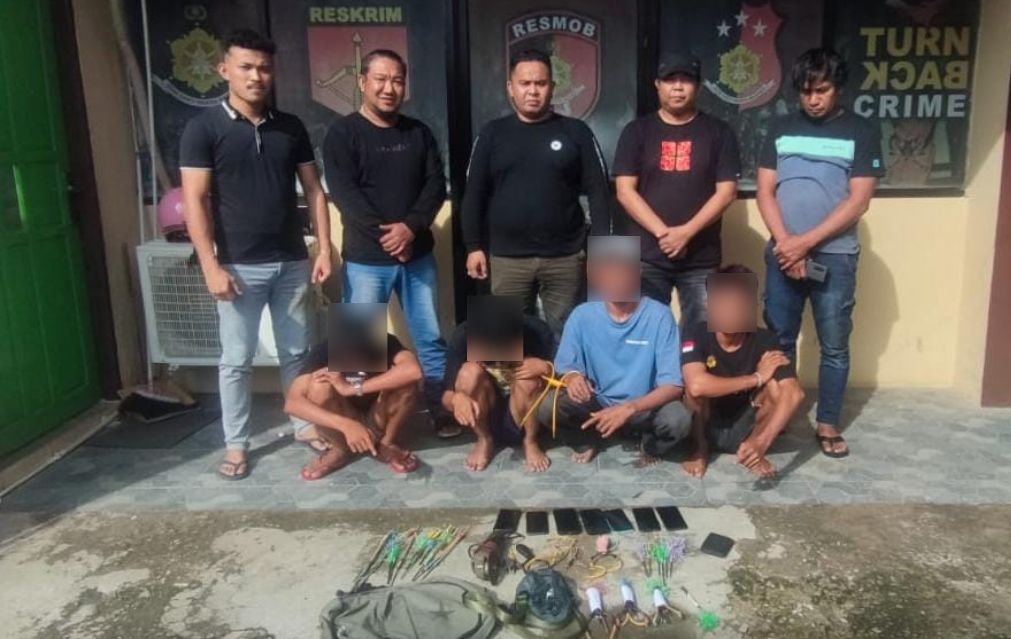 Empat terduga pelaku yang diamankan masing-masing berinisial F (17), A (21), S (20), dan R (13). Dari pengungkapan tersebut, petugas turut menyita 6 ketapel/pelontar, 33 anak panah busur, 2 unit sepeda motor, serta 1 unit mesin gerinda yang digunakan untuk membuat anak busur.