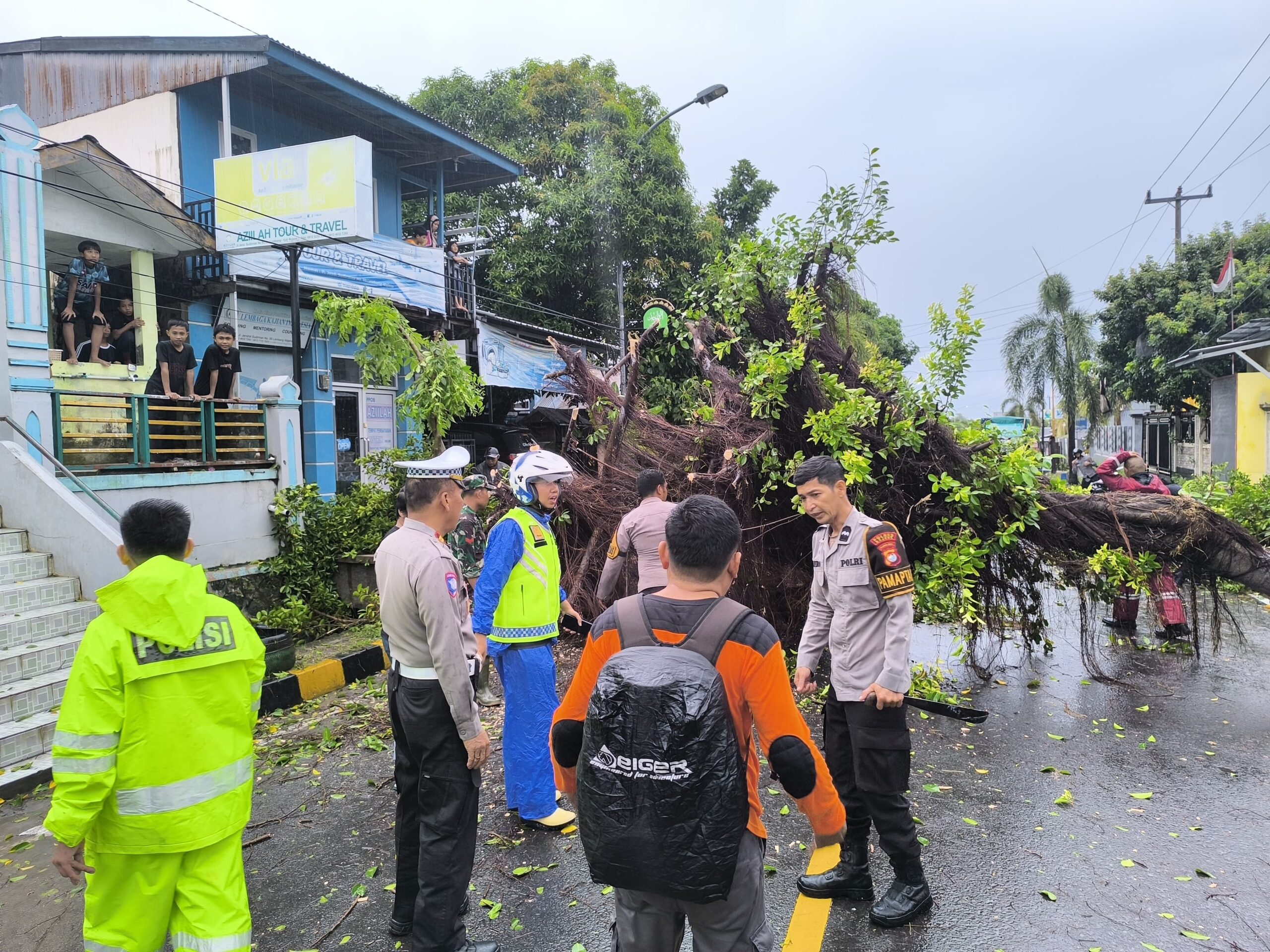 Majene – Personel Polres Majene bergerak cepat melakukan evakuasi pohon tumbang yang menghalangi badan Jalan Trans Sulawesi, tepatnya di Jalan Jenderal Sudirman, Kelurahan Lembang, Kecamatan Banggae Timur, Kabupaten Majene, Selasa (6/1/2026).