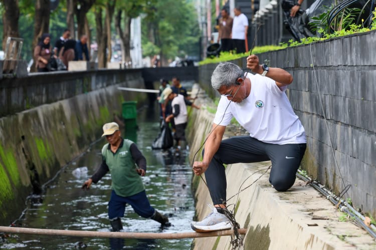 Sekda pun menyusuri selokan di sepanjang trotoar Jalan Pahlawan Nomor 9 Semarang. Ia memungut sampah-sampah kabel, plastik, dan rumput di selokan tersebut.