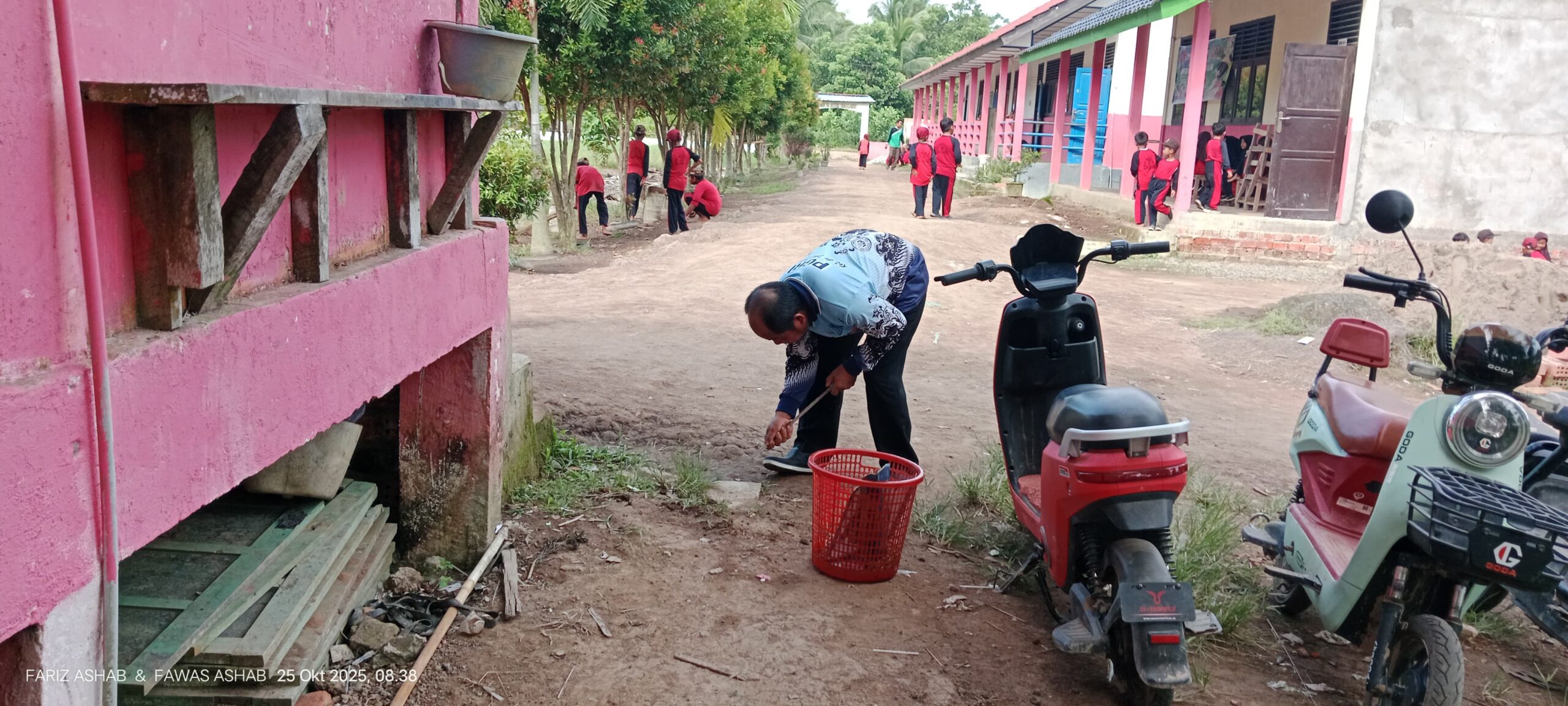 Sejak pagi, suasana sekolah tampak ramai dan penuh semangat. Para siswa bersama para guru bahu-membahu menyapu halaman, mengumpulkan sampah, serta merapikan taman dan area sekitar sekolah agar tampak bersih, indah, dan nyaman.