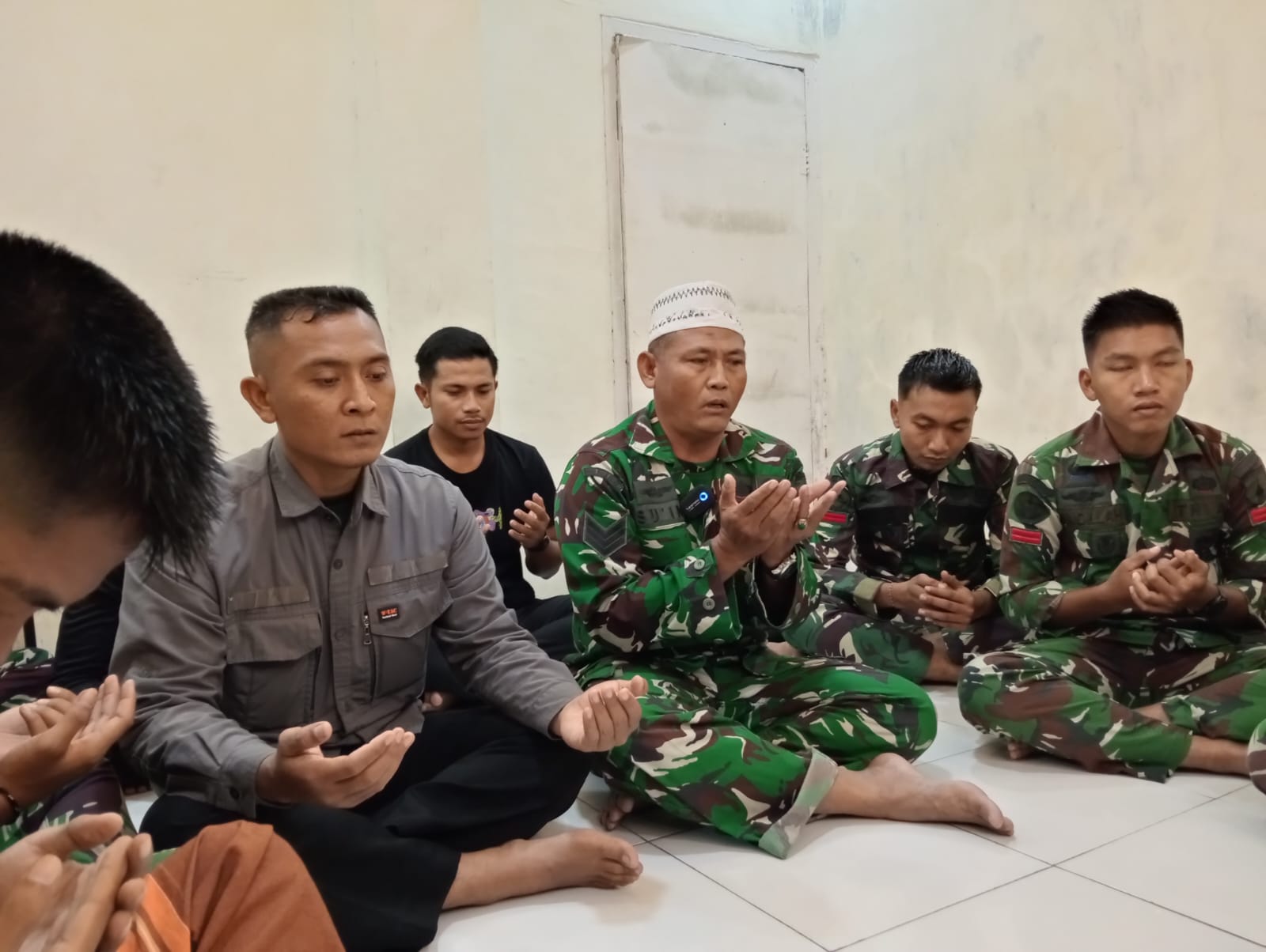 Kebersamaan terlihat saat doa bersama menjelang azan Magrib. Meski pekerjaan pembangunan masih menanti, momen ini menjadi penyemangat bagi prajurit dan warga.