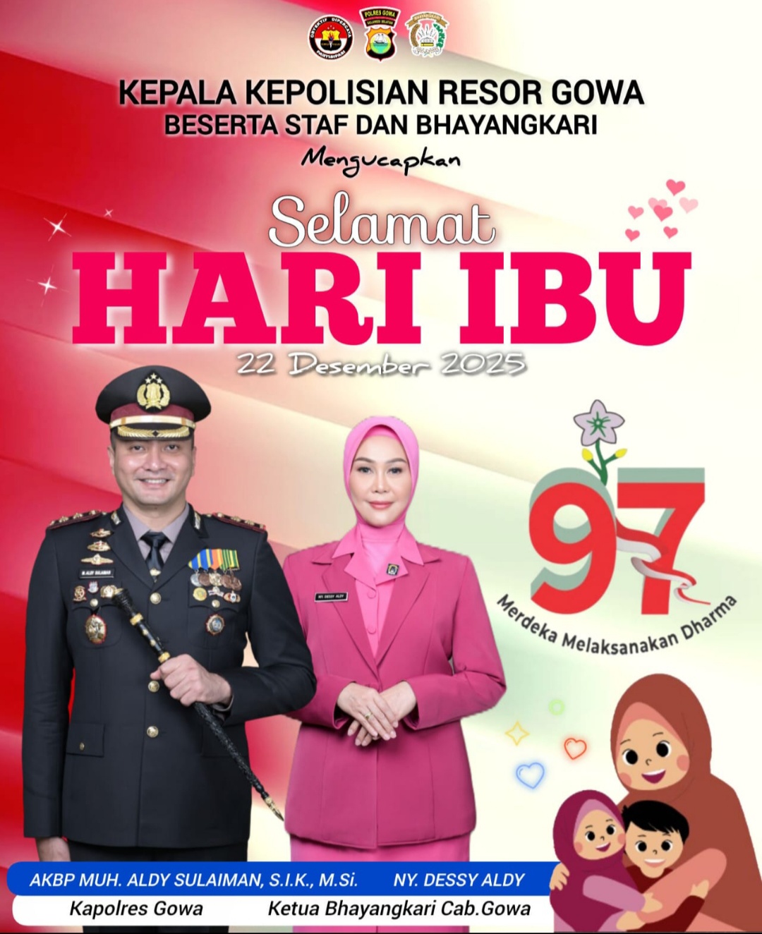 Divisinews.com//Gowa,- Kepala Kepolisian Resor (Kapolres) Gowa AKBP Muhammad Aldy Sulaiman, S.I.K., M.Si., beserta staf dan jajaran Bhayangkari Polres Gowa menyampaikan ucapan Selamat Hari Ibu ke-97 yang diperingati pada Senin, 22 Desember 2025.