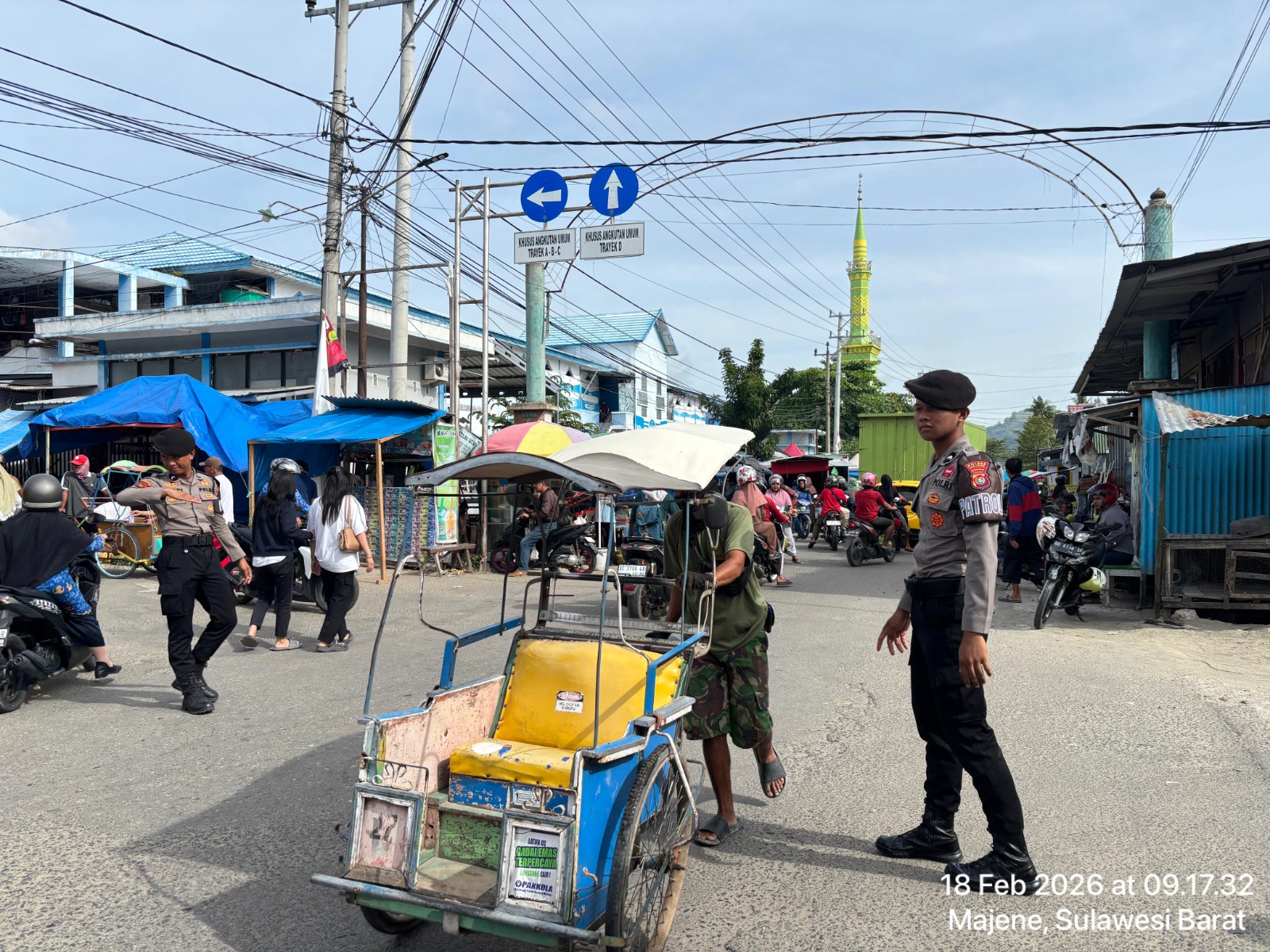 Melihat kondisi tersebut, Satuan Samapta Polres Majene langsung turun ke lapangan untuk melakukan pengaturan lalu lintas dan membantu masyarakat agar aktivitas tetap berjalan lancar. Personel ditempatkan pada titik rawan kepadatan guna mengurai kemacetan sekaligus memberikan rasa aman bagi pengguna jalan.