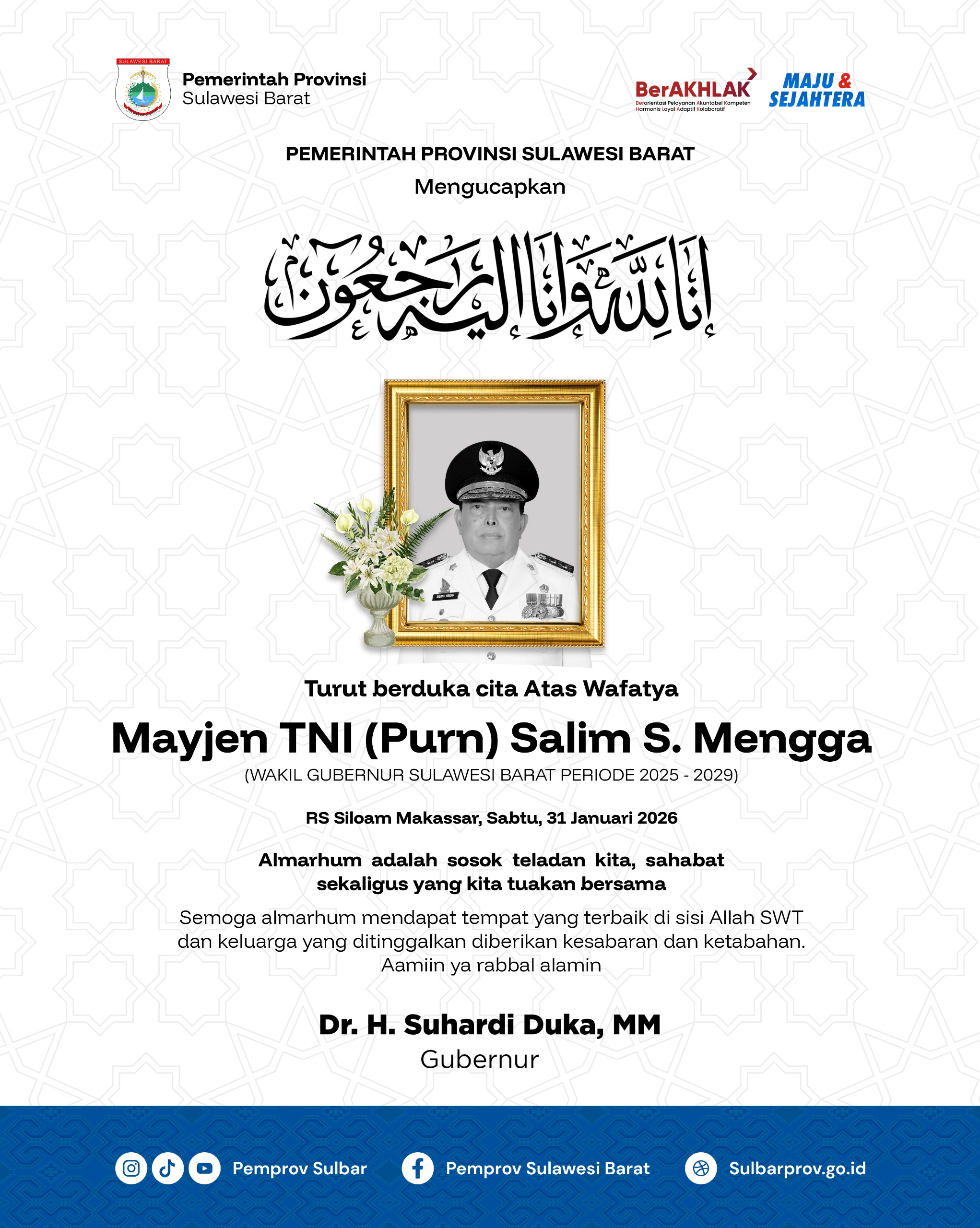 Kepergian Mayor Jenderal TNI (Purn) Salim Mengga menjadi duka mendalam bagi Pemerintah Provinsi Sulawesi Barat dan seluruh masyarakat. Almarhum dikenal sebagai sosok pemimpin yang berdedikasi, berintegritas, serta memiliki komitmen kuat dalam mendukung pembangunan dan stabilitas daerah.