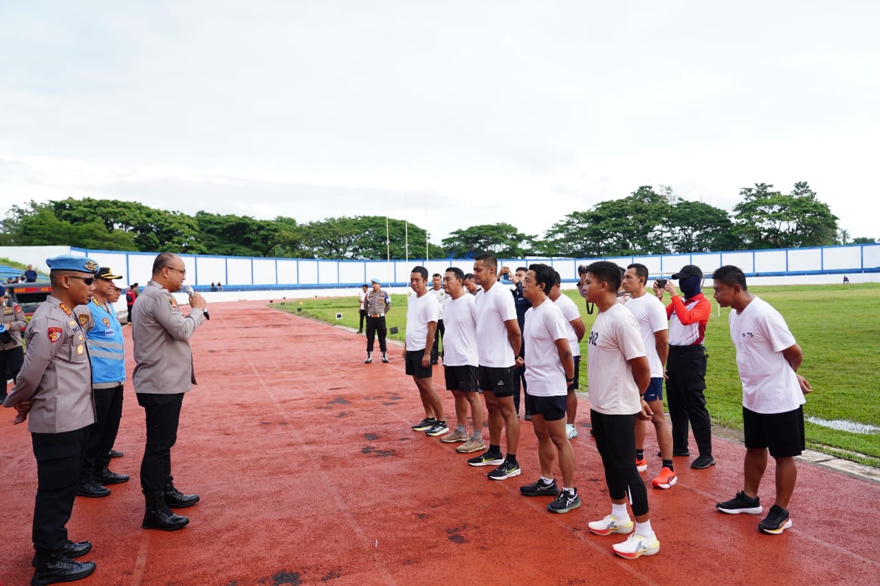 Divisinews.com, Sulawesi Barat- Kapolda Sulawesi Barat, Irjen Pol Adi Deriyan Jayamarta, memberikan arahan dan motivasi kepada para peserta seleksi Sespimmen Polri T.A. 2026 yang tengah mengikuti uji kemampuan jasmani di Stadion Manakarra, Mamuju, Kamis (23/10/25).