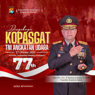 Divisinews.online, Sulawesi Barat – Irjen Pol Adang Ginanjar, Kapolda Sulawesi Barat (Sulbar), turut merayakan hari ulang tahun ke-77 Tentara Nasional Indonesia Angkatan Udara (TNI AU) dengan penuh suka cita. Melalui unggahan di media sosial resmi Polda Sulbar, Kapolda menyampaikan ucapan selamat dan harapannya untuk TNI AU.