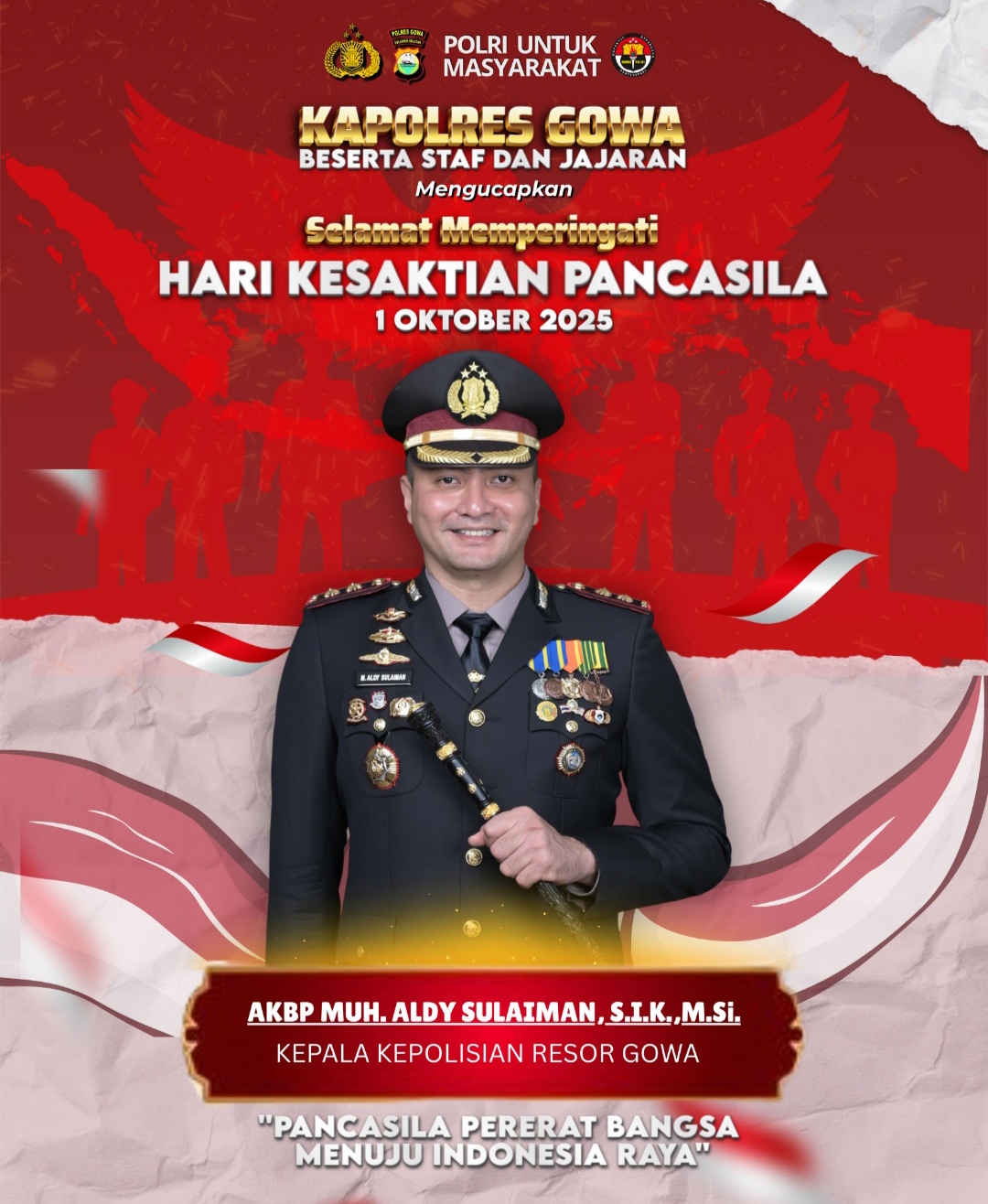 Divisinews.com//Gowa,- Kapolres Gowa, AKBP Muh. Aldy Sulaiman, S.I.K., M.Si., bersama seluruh staf dan jajaran Polres Gowa menyampaikan ucapan Selamat Memperingati Hari Kesaktian Pancasila yang jatuh pada 1 Oktober 2025, Rabu (1/10/2025).