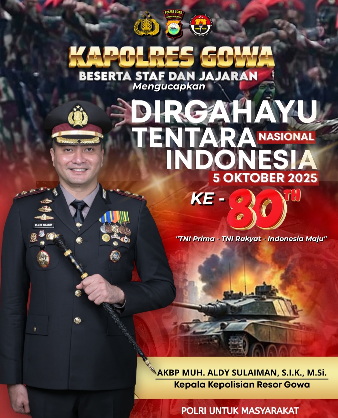 “Selamat Dirgahayu ke-80 Tentara Nasional Indonesia. TNI Prima – TNI Rakyat – Indonesia Maju. Semoga sinergi dan soliditas TNI-Polri semakin kuat dalam menjaga keamanan dan keutuhan bangsa,” ujar Kapolres Gowa.