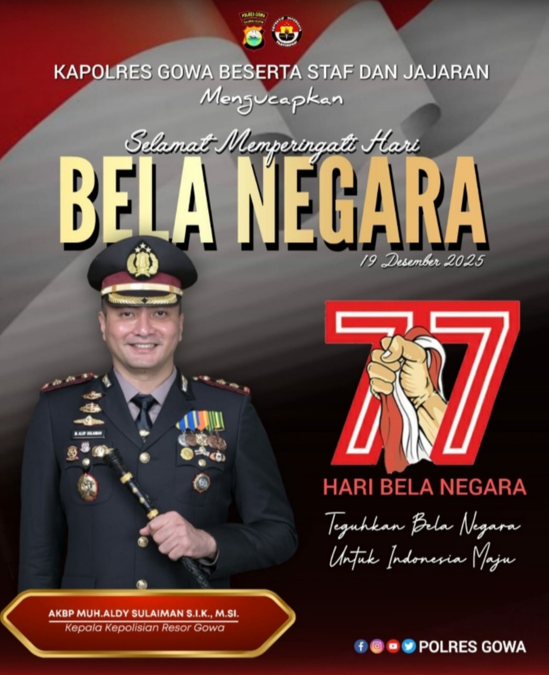 Divisinews.com//Gowa,- Kapolres Gowa AKBP Muhammad Aldy Sulaiman, S.I.K., M.Si. beserta staf dan seluruh jajaran Polres Gowa mengucapkan Selamat Memperingati Hari Bela Negara ke-77, yang diperingati pada 19 Desember 2025, Jum’at (19/12/2025).