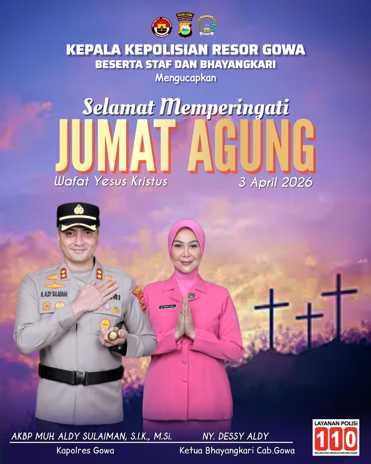 Divisinews.com//Gowa- Kepala Kepolisian Resor Gowa AKBP Muhammad Aldy Sulaiman, S.I.K., M.Si bersama staf dan Bhayangkari menyampaikan ucapan Selamat Memperingati Jumat Agung kepada seluruh umat Kristiani, Jumat (3/4/2026).