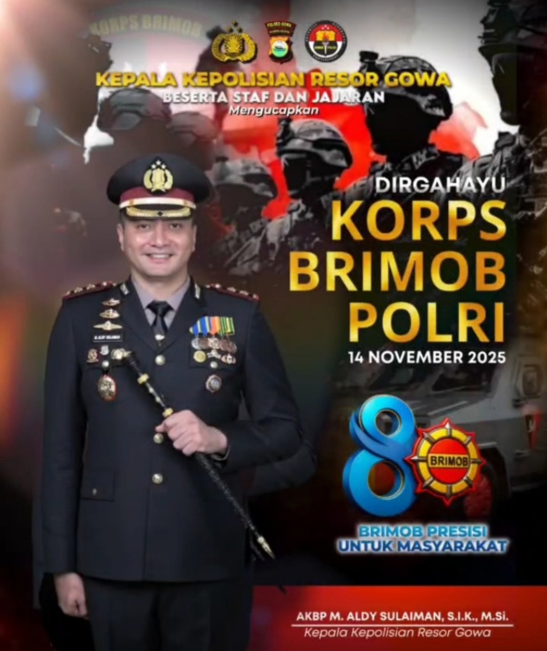 Divisinews.com//Gowa, – Kepala Kepolisian Resor Gowa AKBP Muhammad Aldy Sulaiman, S I.K, M.Si beserta seluruh staf dan jajaran menyampaikan ucapan Dirgahayu Korps Brimob Polri ke-80, sebagai bentuk penghargaan atas dedikasi dan pengabdian Brimob dalam menjaga keamanan serta melindungi masyarakat di seluruh wilayah Indonesia, Jum’at (14/11/2025).
