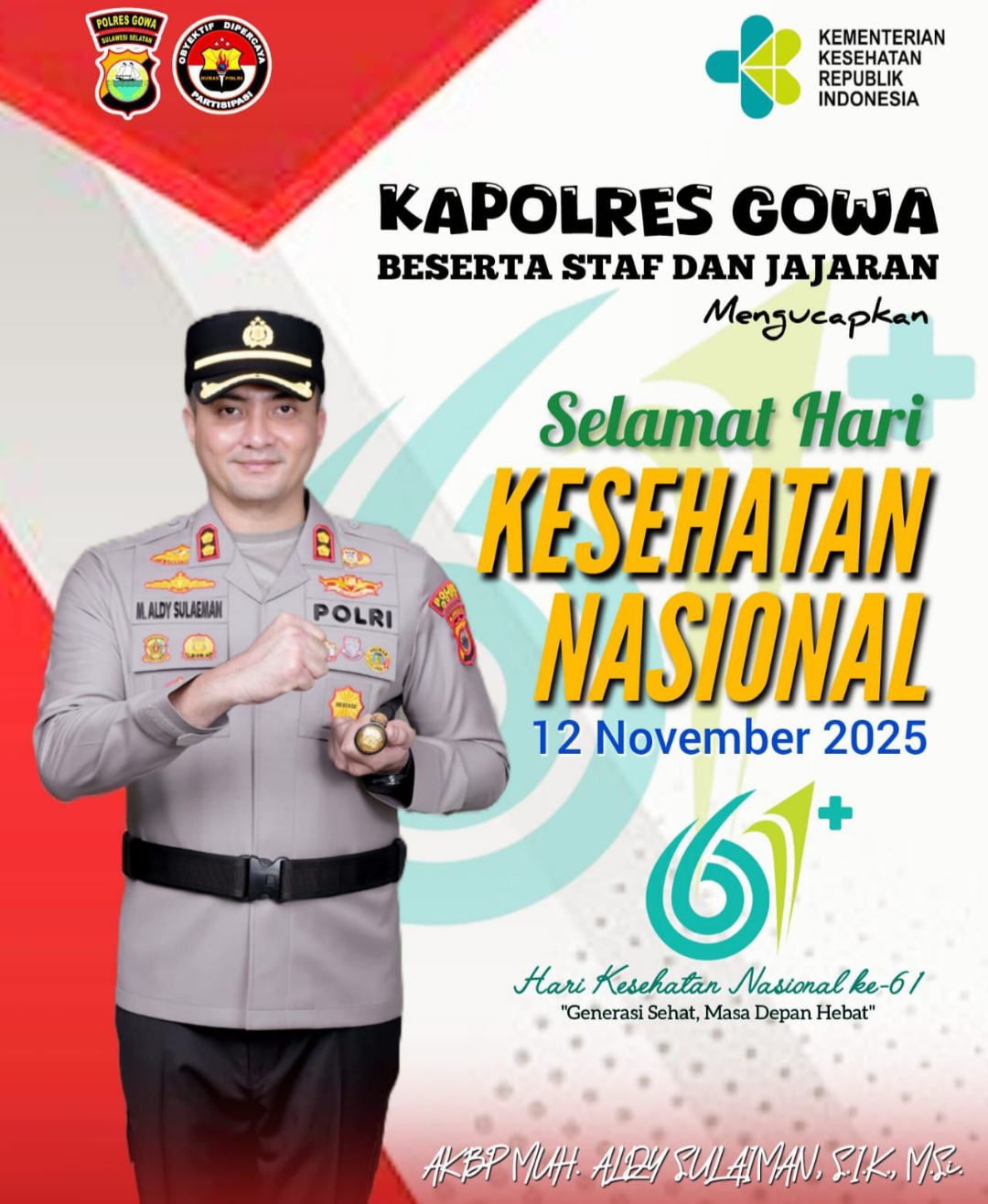 Divisinews.com//Gowa, – Dalam rangka memperingati Hari Kesehatan Nasional (HKN) ke-61, Kapolres Gowa AKBP Muhammad Aldy Sulaiman, S.I.K, M.Si beserta seluruh staf dan jajaran Polres Gowa, Rabu (12/11/2025), menyampaikan ucapan Selamat Hari Kesehatan Nasional, yang diperingati setiap tanggal 12 November.