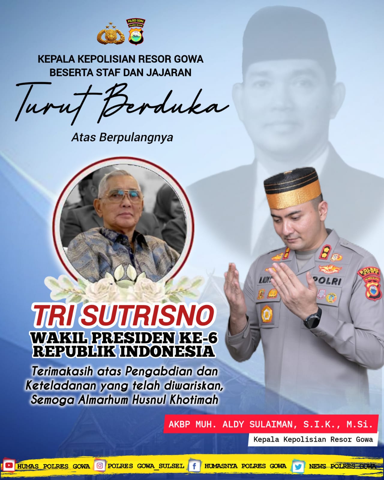 Divisinews.com//Gowa,- Kepala Kepolisian Resor Gowa, AKBP Muhammad Aldy Sulaiman, S.I.K., M.Si., beserta staf dan seluruh jajaran Polres Gowa menyampaikan turut berduka cita yang mendalam atas berpulangnya Wakil Presiden ke-6 Republik Indonesia, Tri Sutrisno, Senin (02/3/2026).