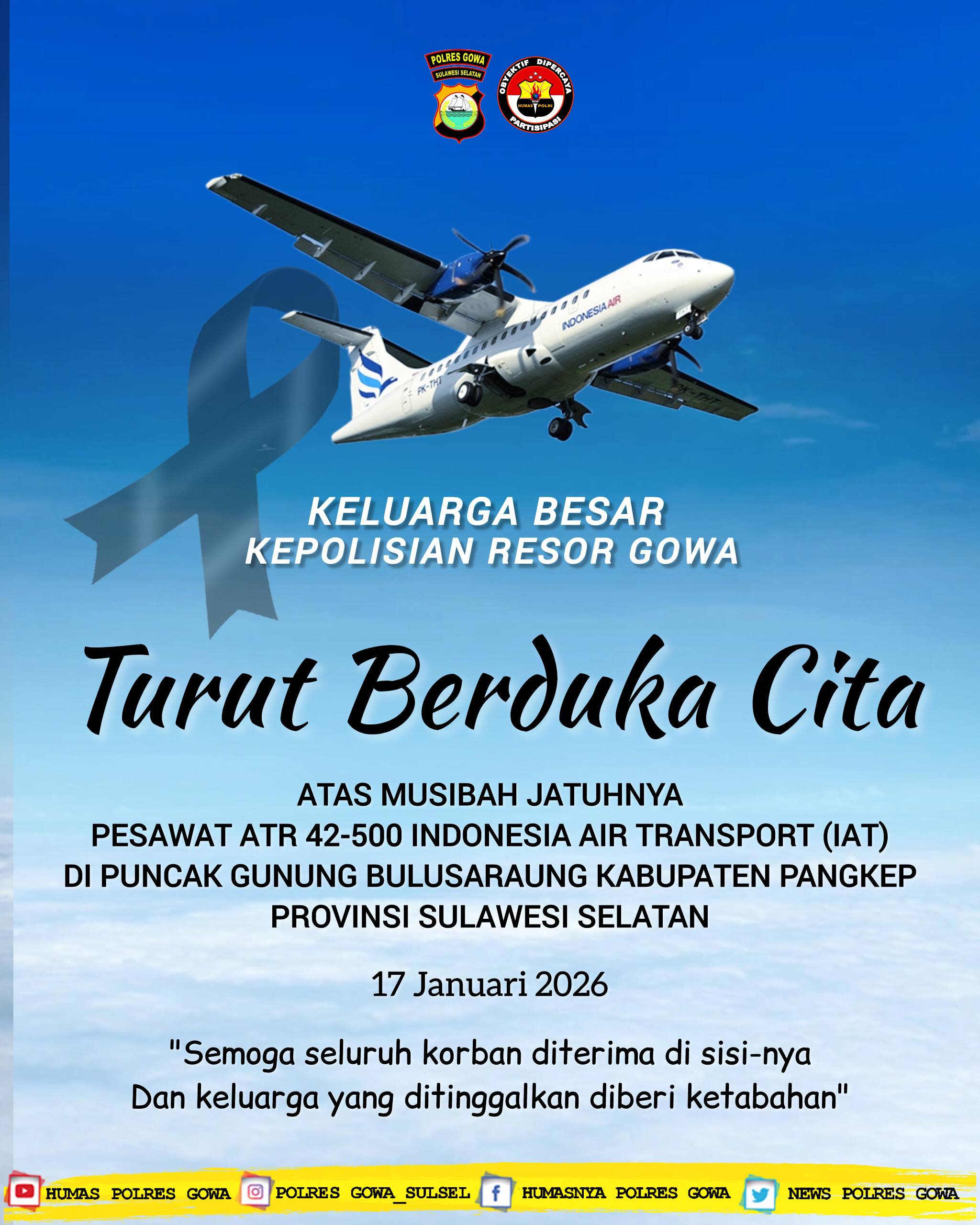 Divisinews.com//Gowa,- Keluarga Besar Kepolisian Resor (Polres) Gowa menyampaikan turut berduka cita yang mendalam atas musibah jatuhnya pesawat ATR 42-500 milik Indonesia Air Transport (IAT) di Puncak Gunung Bulusaraung, Kabupaten Pangkep, Provinsi Sulawesi Selatan, pada Jumat, 17 Januari 2026.