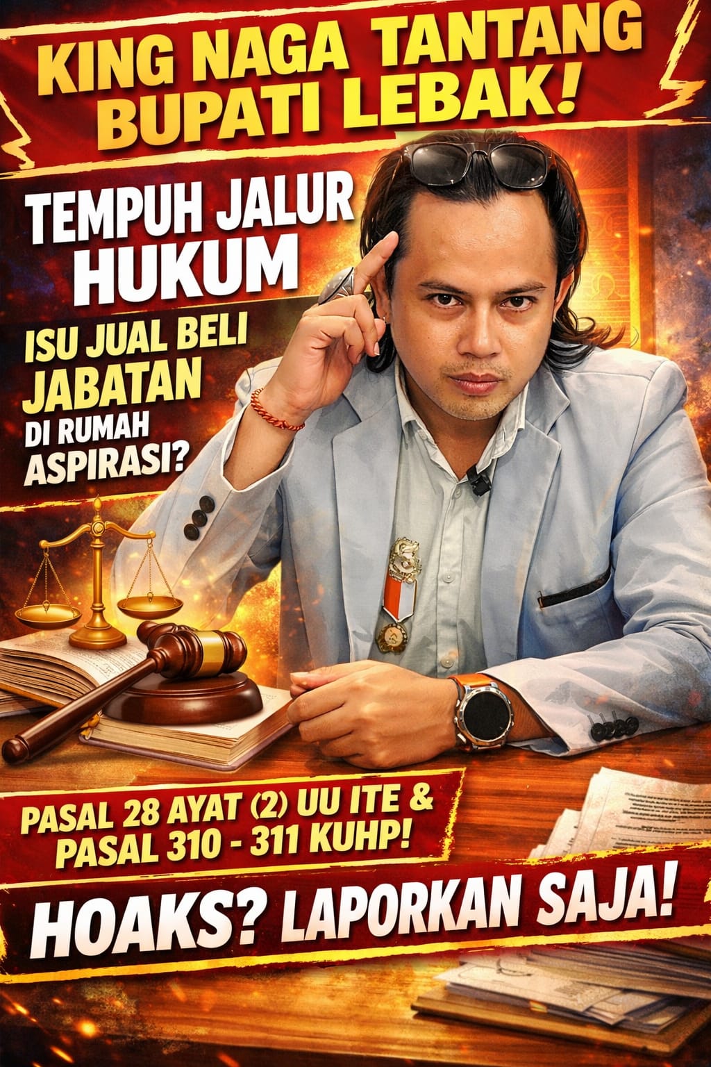 Dalam keterangannya kepada awak media rabu (11 Maret 2026), King Naga secara terbuka menantang Bupati Lebak untuk menempuh jalur hukum apabila informasi yang beredar terkait dugaan aktivitas di Rumah Aspirasi tersebut dianggap sebagai berita bohong atau hoaks.