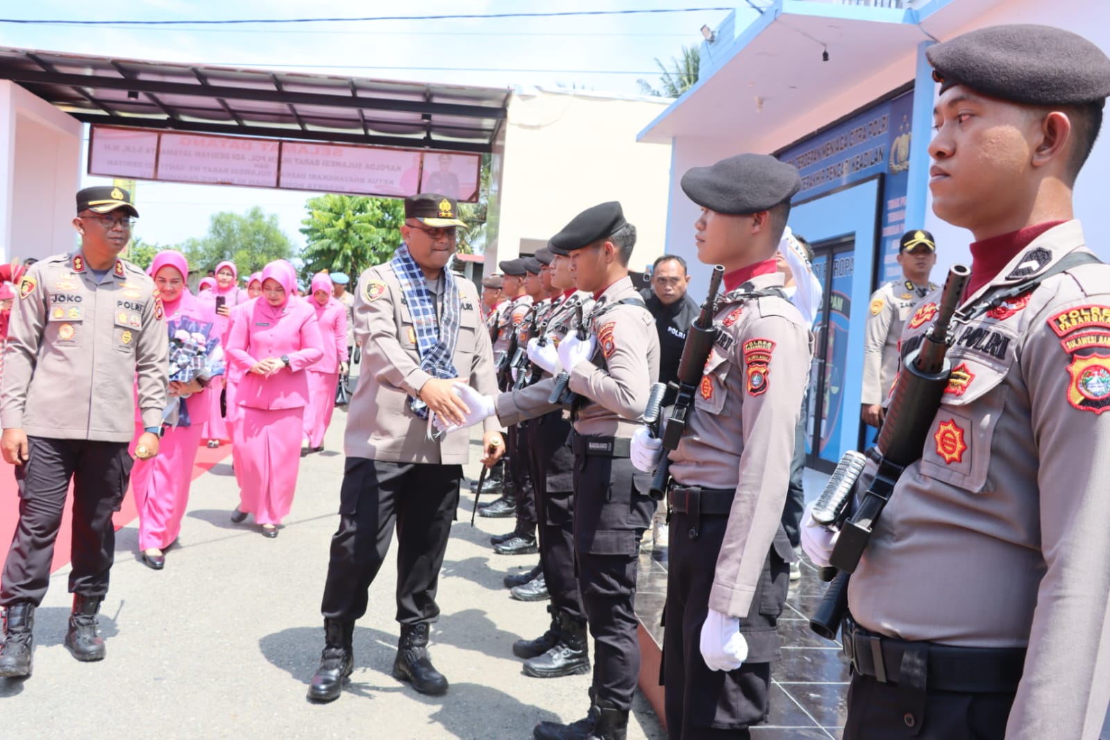Dalam kunjungan ini, Kapolda didampingi sejumlah Pejabat Utama Polda Sulbar. Kedatangannya disambut langsung oleh Kapolres Pasangkayu AKBP Joko Kusumadinata, S.H., S.I.K., bersama para pejabat utama Polres Pasangkayu serta jajaran anggota. Suasana penyambutan berlangsung khidmat dan penuh semangat kebersamaan.