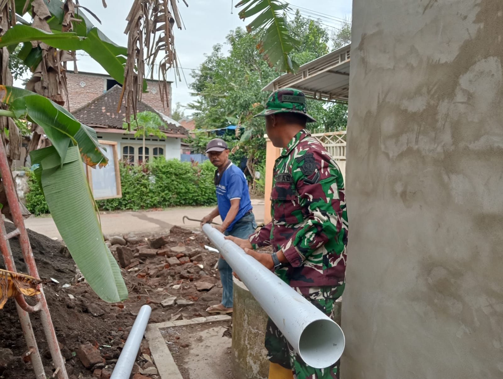 Proses pengerjaan dilakukan secara gotong royong, mencerminkan kuatnya sinergi antara TNI dan masyarakat dalam membangun fasilitas umum yang bermanfaat langsung bagi warga.