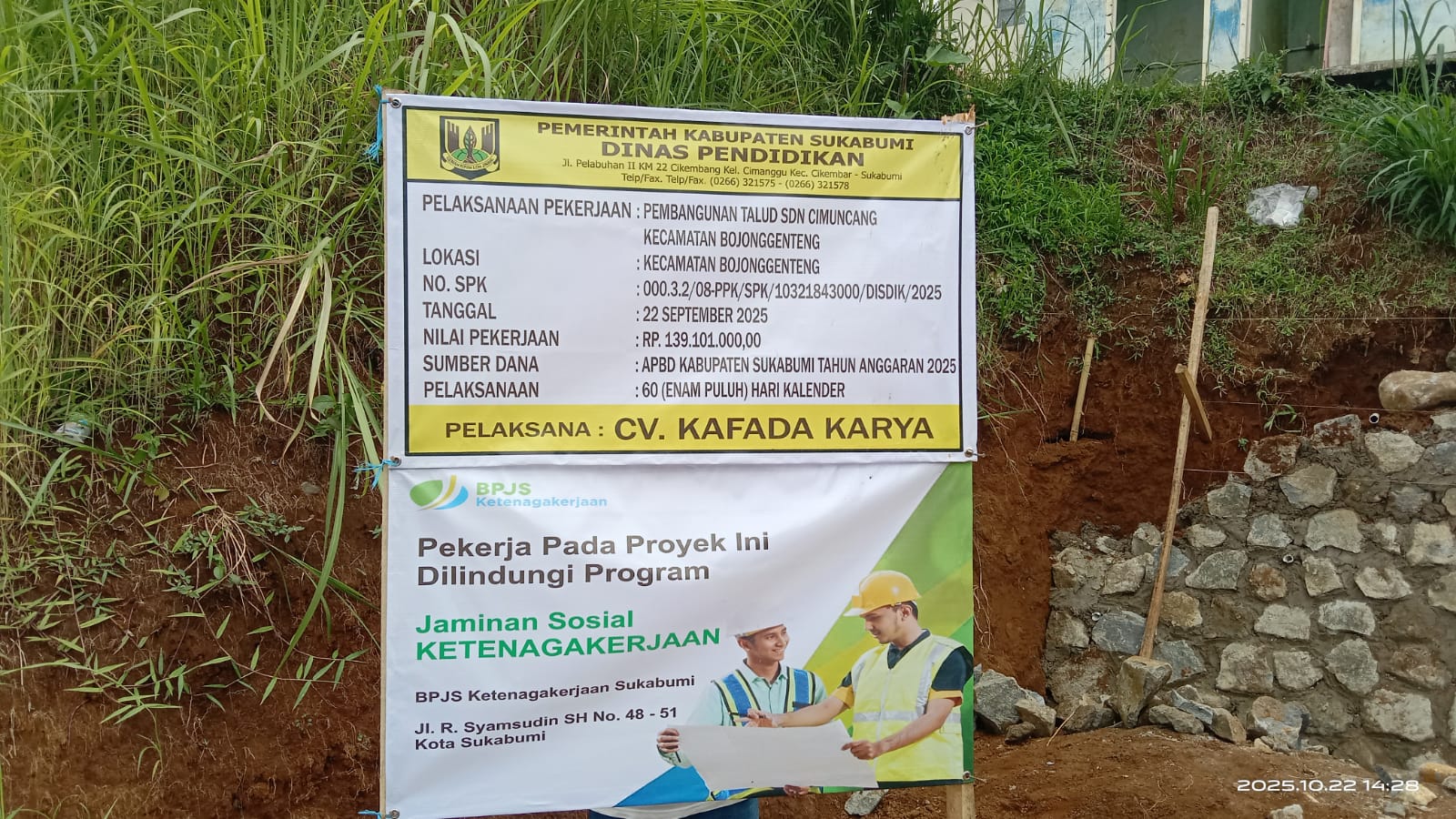 SUKABUMI , Divisinews.com— Pemerintah Kabupaten Sukabumi melalui Dinas Pendidikan terus berupaya meningkatkan sarana dan prasarana pendidikan di berbagai wilayah. Salah satu upayanya adalah melalui pembangunan talud di SDN Cimuncang, Kecamatan Bojonggenteng, kabupaten sukabumi, yang kini resmi dilaksanakan.pada rabu, (22/10/2025).