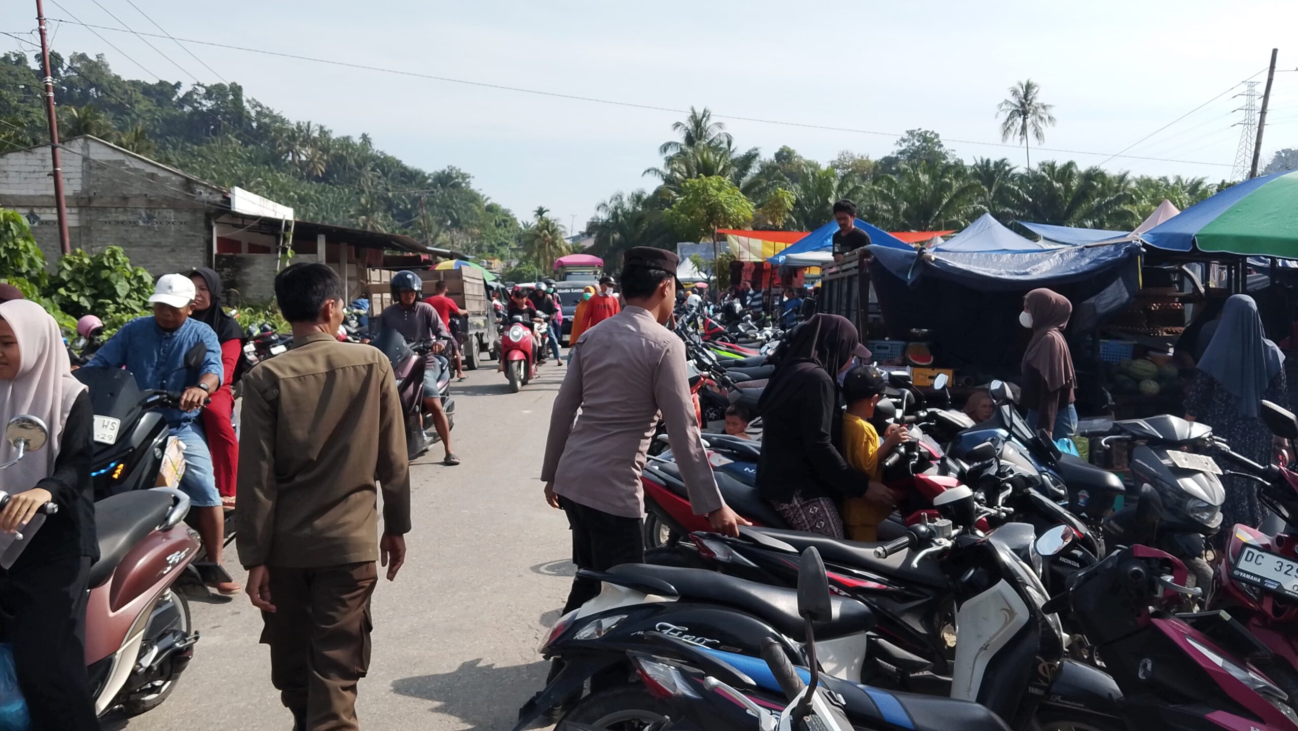 Personel Pos Pam Baras tampak aktif mengatur kendaraan yang melintas di sekitar area pasar guna menghindari kemacetan akibat meningkatnya aktivitas jual beli masyarakat.