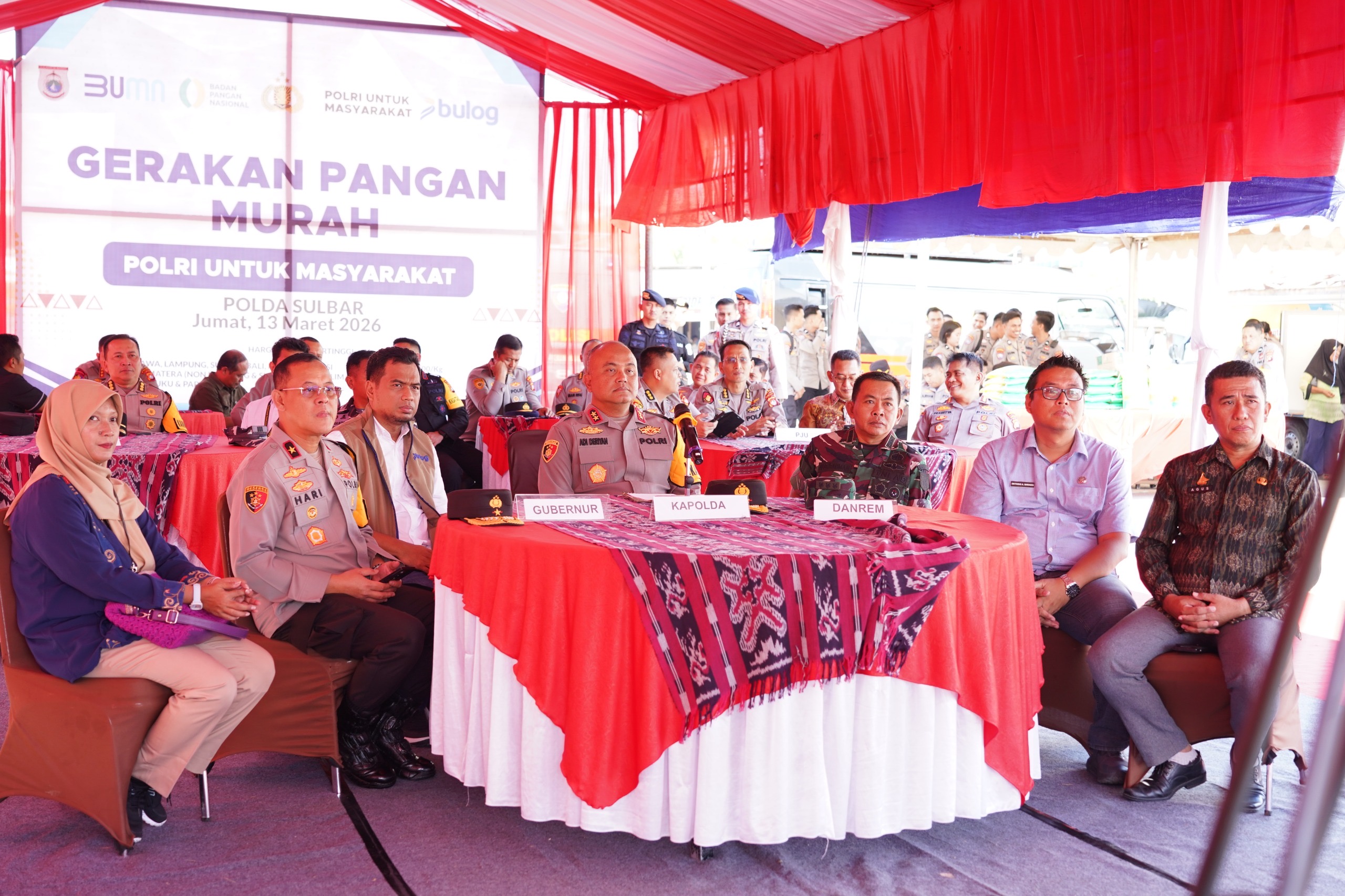 Sulawesi Barat- Kepolisian Daerah Sulawesi Barat bekerja sama dengan pemerintah daerah menggelar gerakan pangan murah di Kompleks Terminal Pasar Baru Mamuju, Jumat (13/3/26).