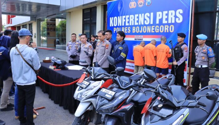 Kapolres Bojonegoro,AKBP Afrian Satya Permadi menjelaskan, Lima orang tersangka telah diamankan karena diduga terlibat dalam serangkaian aksi pencurian sepeda motor di wilayah Bojonegoro.