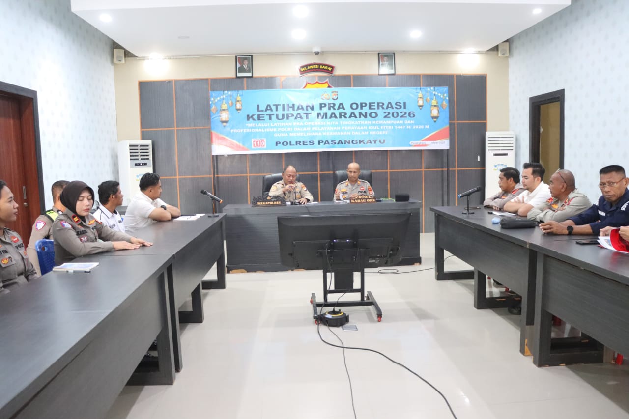 Pasangkayu – Polres Pasangkayu menggelar Latihan Pra Operasi Ketupat Marano 2026 sebagai bentuk kesiapan personel dalam menghadapi pengamanan Hari Raya Idul Fitri 1447 H / 2026 M. Kegiatan tersebut dilaksanakan pada Rabu, 11 Maret 2026 pukul 09.00 WITA bertempat di Aula Rupatama Polres Pasangkayu.