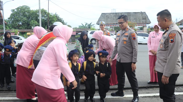 Kapolres Purbalingga AKBP Achmad Akbar bersama Ketua Bhayangkari Cabang Purbalingga Nina Akbar menyambut langsung kedatangan para siswa. Sejumlah Polwan dan badut polisi turut menyambut dengan ramah, menciptakan suasana hangat dan bersahabat.