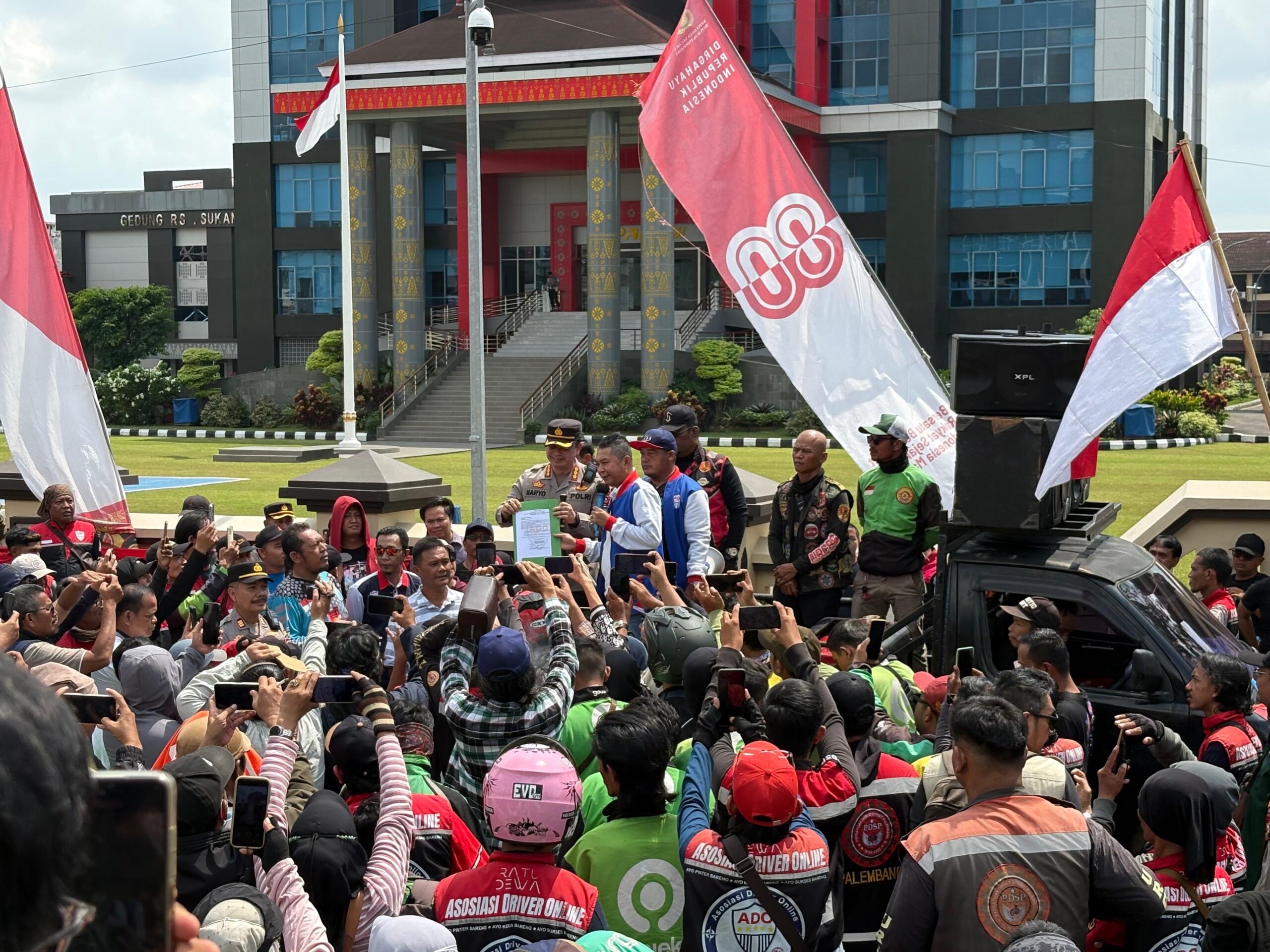 “Polda Sumsel mengapresiasi aksi yang berlangsung damai, tertib, dan kondusif. Aspirasi yang disampaikan para driver online akan kami teruskan kepada pimpinan, dan kami pastikan proses hukum di Jakarta berjalan transparan serta profesional,” jelasnya.