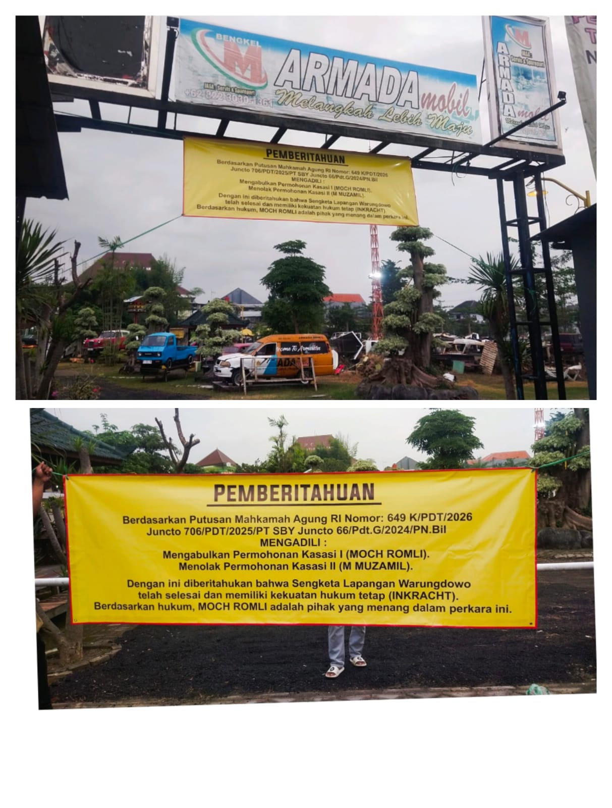 Sebagai bentuk penyampaian informasi kepada masyarakat, pihak kuasa hukum memasang spanduk di lokasi sengketa yang memuat ringkasan putusan Nomor 649 K/PDT/2026 juncto 706/PDT/2025 juncto 66/Pdt.G/2024.