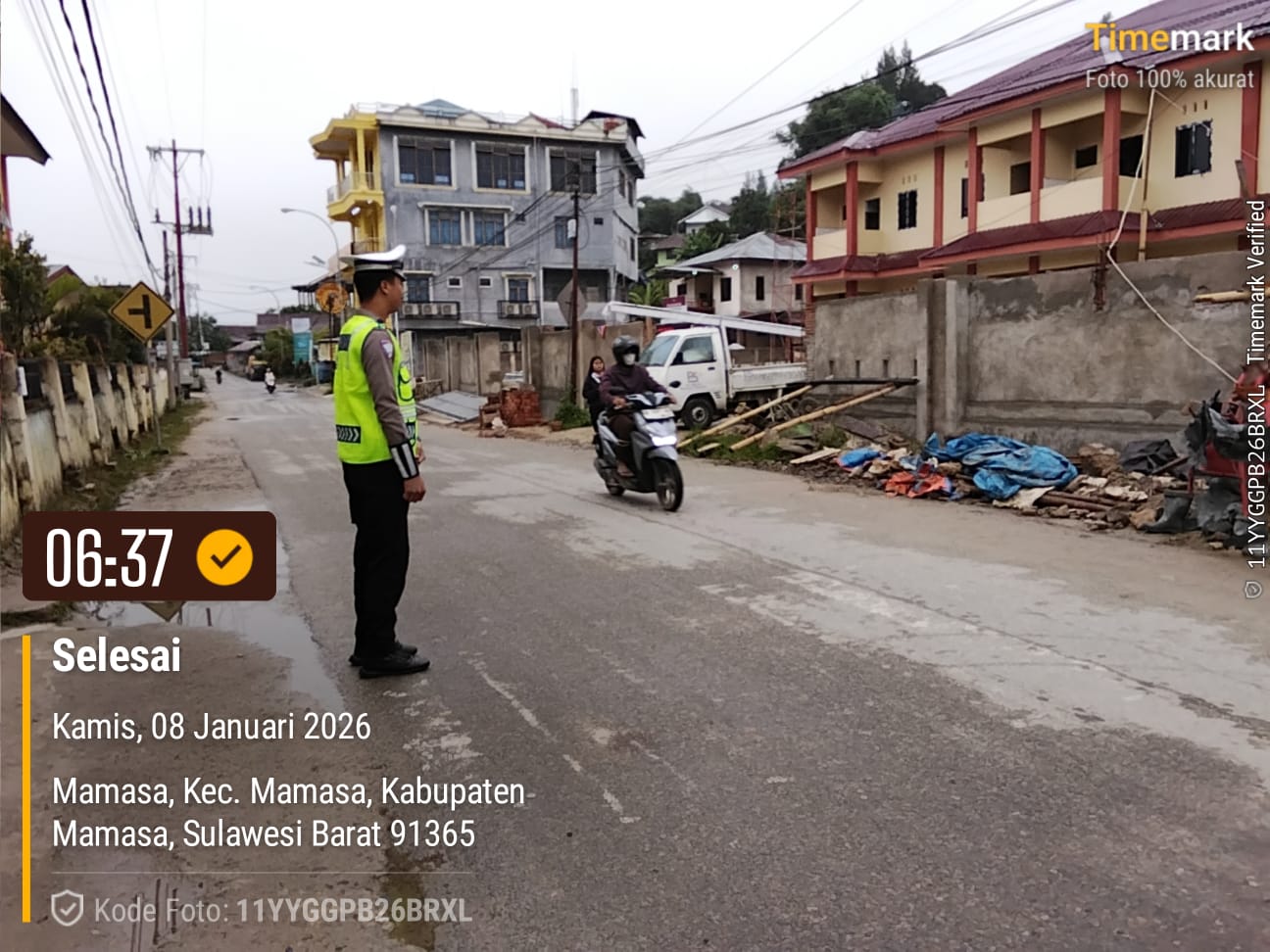 Dalam kegiatan tersebut, personel Sat Lantas Polres Mamasa melaksanakan pengaturan dan penjagaan arus lalu lintas guna mengantisipasi terjadinya kemacetan maupun potensi kecelakaan lalu lintas, khususnya pada jam sibuk pagi hari saat aktivitas masyarakat meningkat.