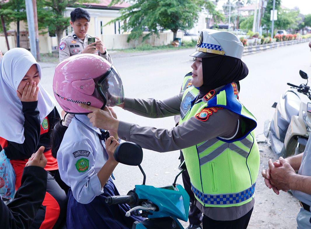 Personel Sat Lantas Polres Pasangkayu secara humanis membagikan helm berstandar SNI sekaligus memberikan edukasi dan himbauan pentingnya penggunaan helm saat berkendara demi keselamatan diri di jalan raya. Kegiatan ini merupakan bentuk kepedulian Polri dalam menekan angka kecelakaan lalu lintas serta menumbuhkan kesadaran masyarakat untuk selalu tertib berlalu lintas.
