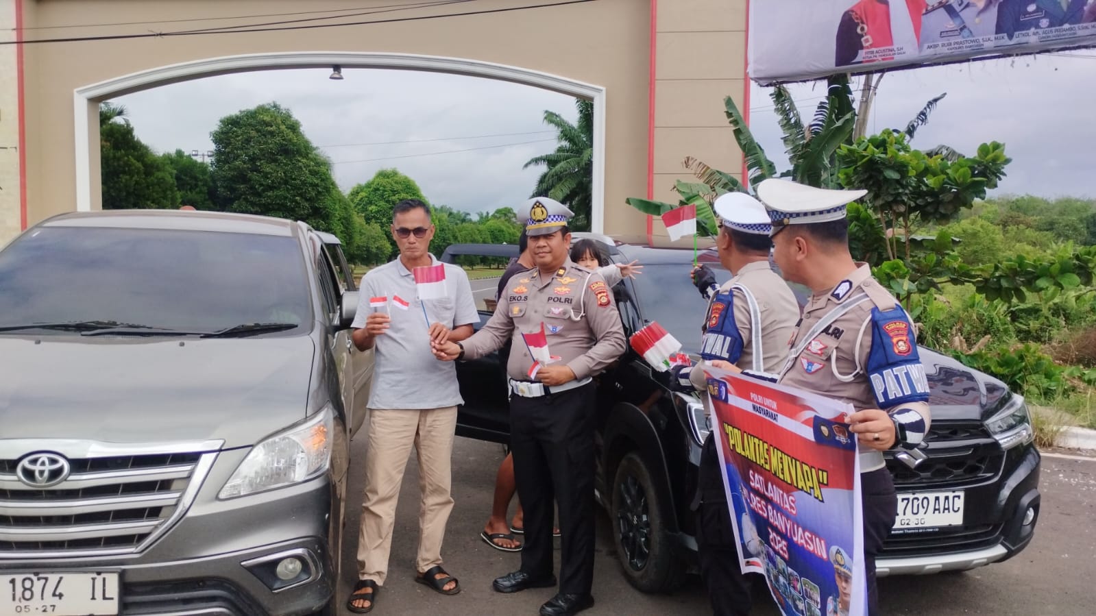 Kasat Lantas Polres Banyuasin AKP Suwandi mengadakan, kegiatan ini bertujuan untuk Menumbuhkan rasa Nasionalisme dan Cinta Tanah Air kepada Pengendara Kendaraan dalam rangka Peringatan Hari Kemerdekaan Republik Indonesia ke – 80.