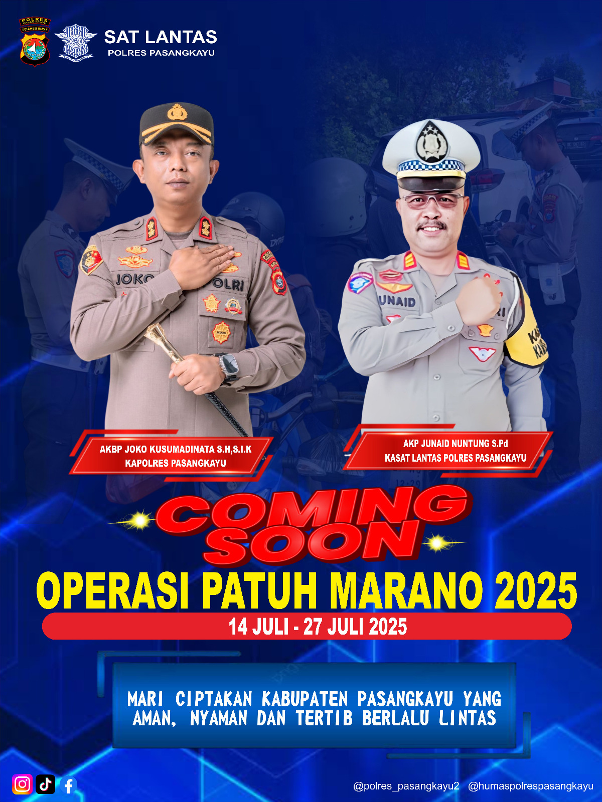 Pasangkayu – Dalam rangka meningkatkan kesadaran dan kepatuhan masyarakat terhadap peraturan lalu lintas, Satuan Lalu Lintas (Satlantas) Polres Pasangkayu akan menggelar Operasi Patuh Marano 2025 yang dijadwalkan berlangsung mulai 14 Juli hingga 27 Juli 2025.