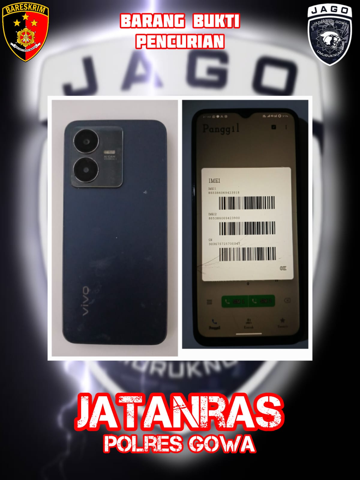 Pada malam harinya, pukul 20.00 WITA, dilakukan pencarian barang bukti di kediaman pelaku di BTN Bakolu, Desa Mangalli, Kecamatan Pallangga, Gowa. Polisi berhasil menyita satu unit HP Vivo Y22 warna Starlit Blue.
